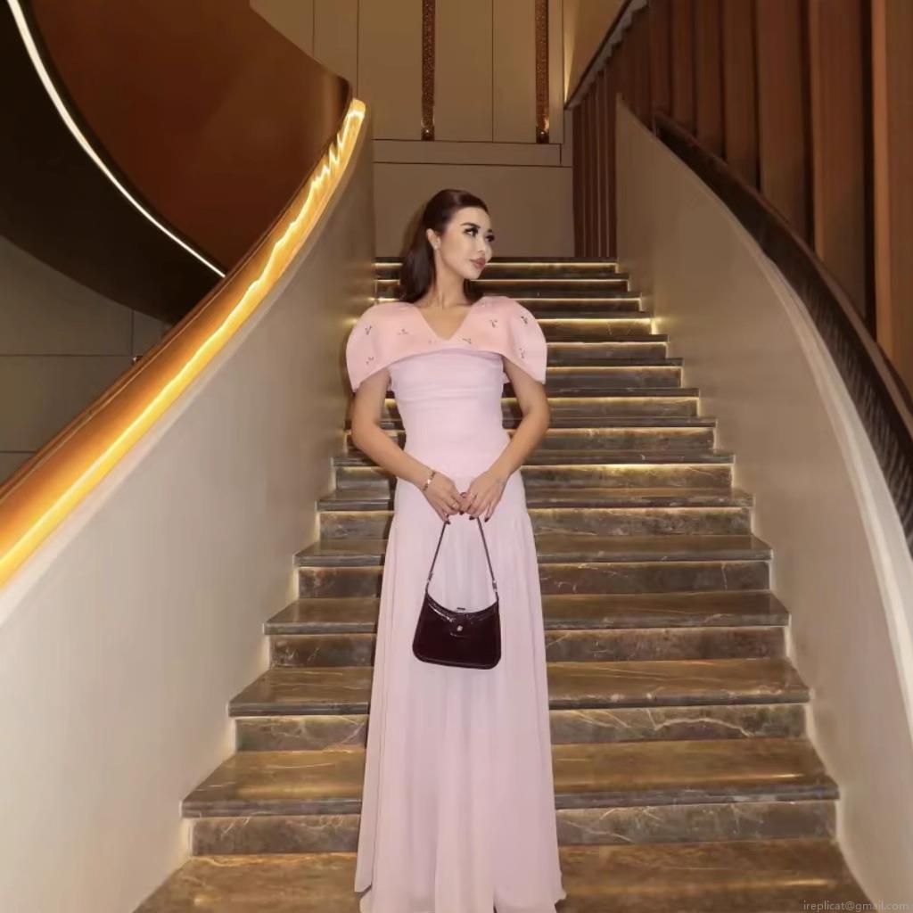 • Women Elegant Pink Shawl Long Dress Embroidered Pleated Evening Gown For Wedding Party Socialite Style Chiffon Look Maxi Dress