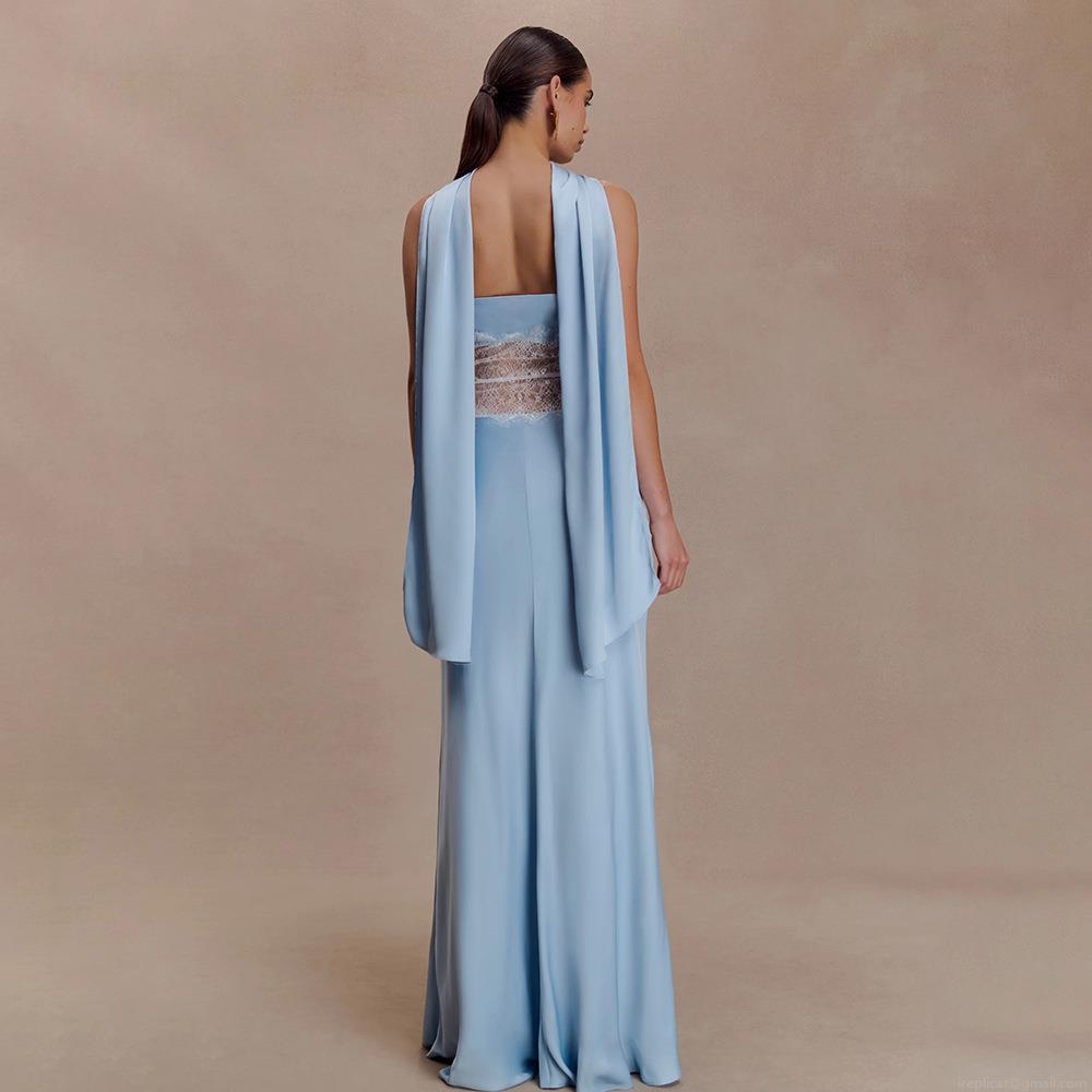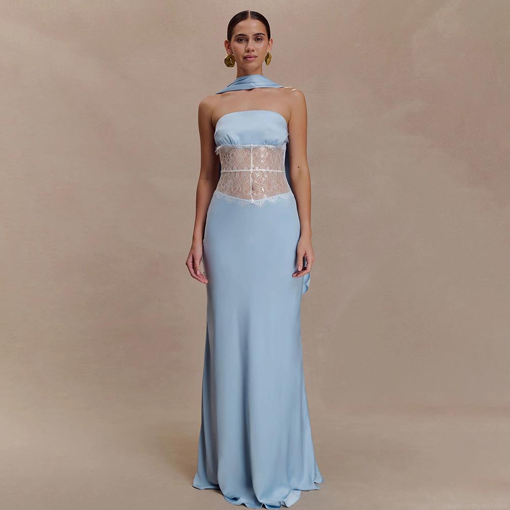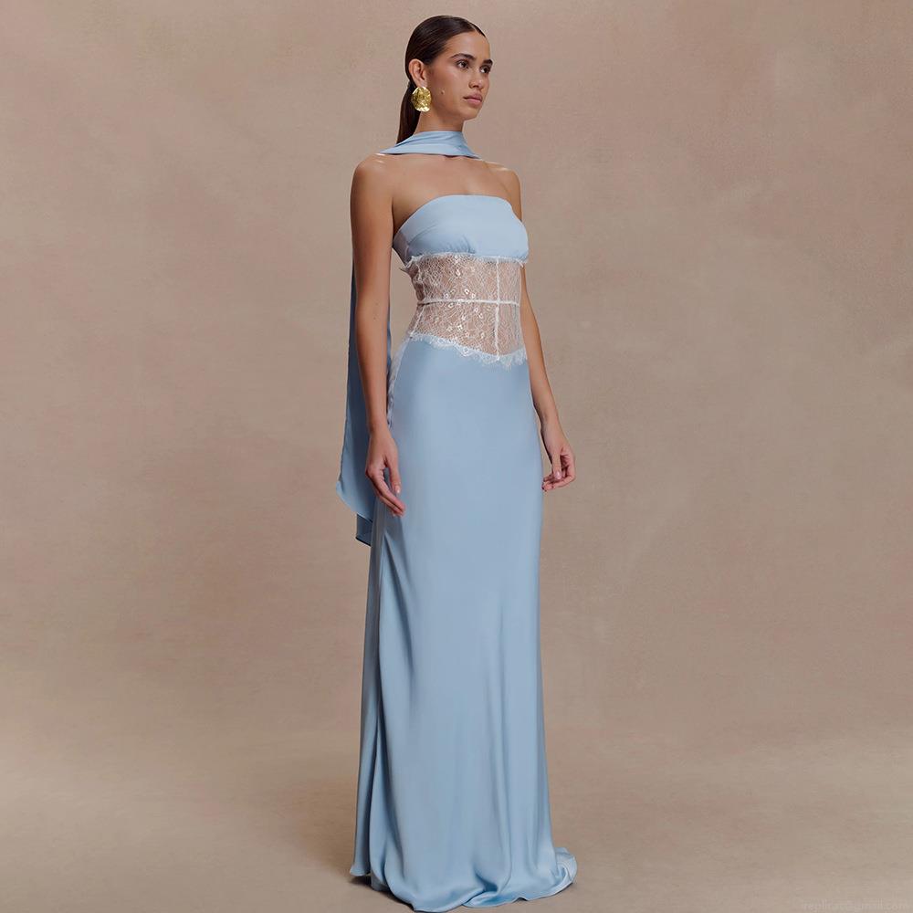 Women Elegant Strapless Satin Lace Splicing Long Evening Gown Sexy Backless Sheer Banquet Party Dress With Detachable Scarf Blue Maxi Dress