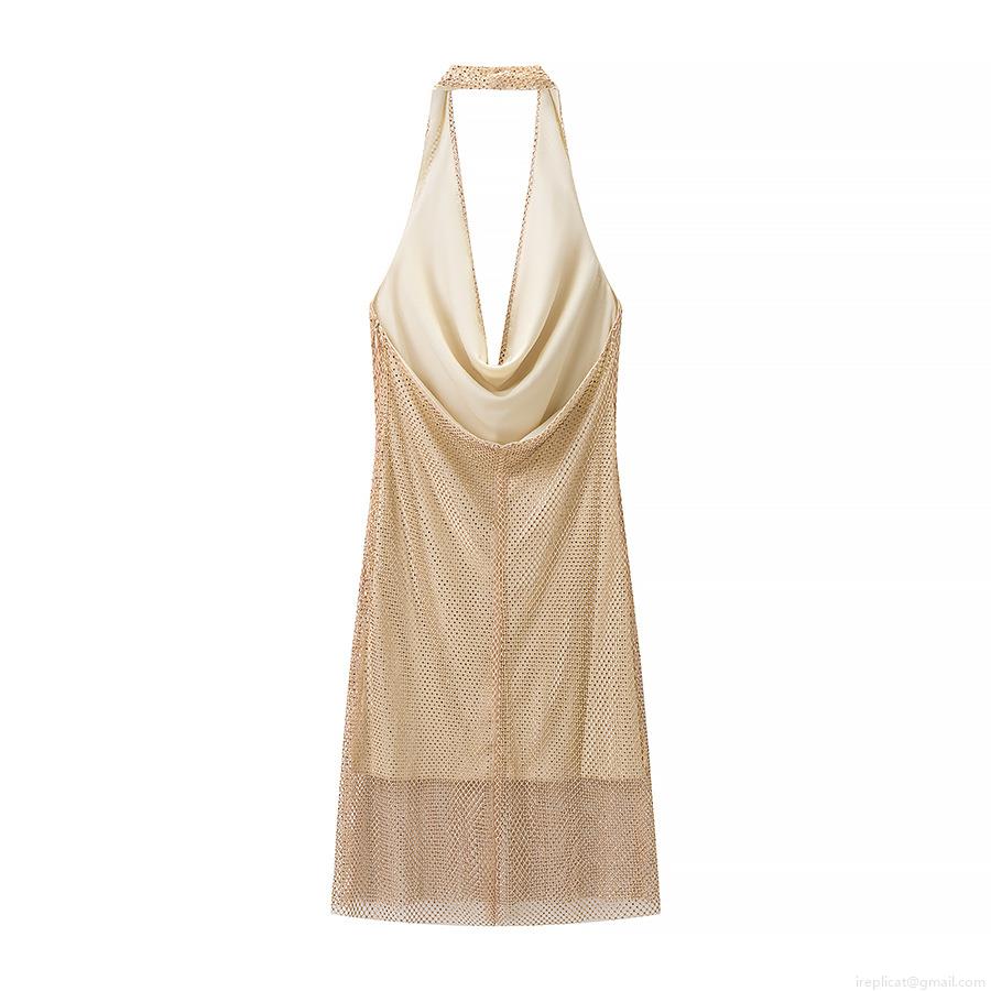 • Women Halter Neck Backless Cowl Neck Midi Dress Sexy Champagne Gold Rhinestone Mesh Patchwork Evening Party Bodycon Club Dress For Lady