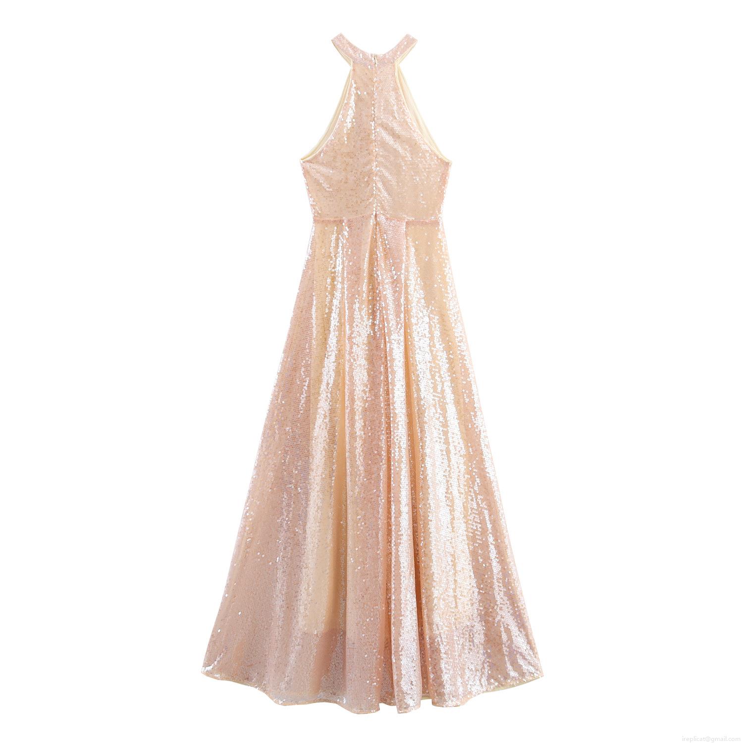 • Women Halter Neck Sequin Maxi Dress Elegant Sleeveless Backless Evening Party Gown Champagne Luxury Celebration Dress