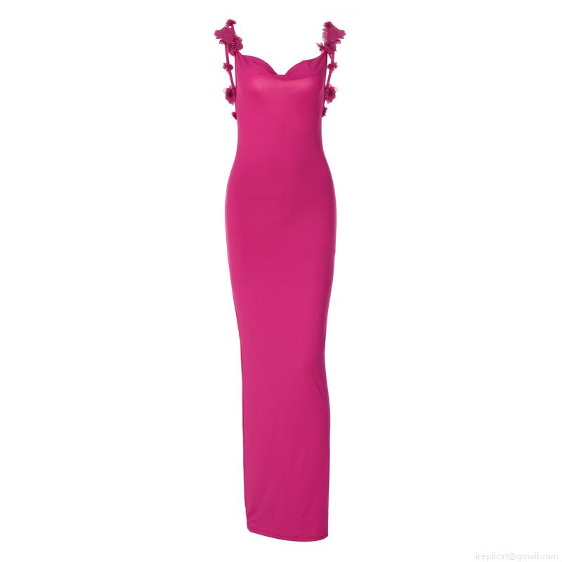• Women Sexy Backless Cami Maxi Dress With 3D Floral Shoulder Straps Cowl Neck Slim Fit Floor Length Banquet Party Evening Gown Hot Pink Polyester Dress