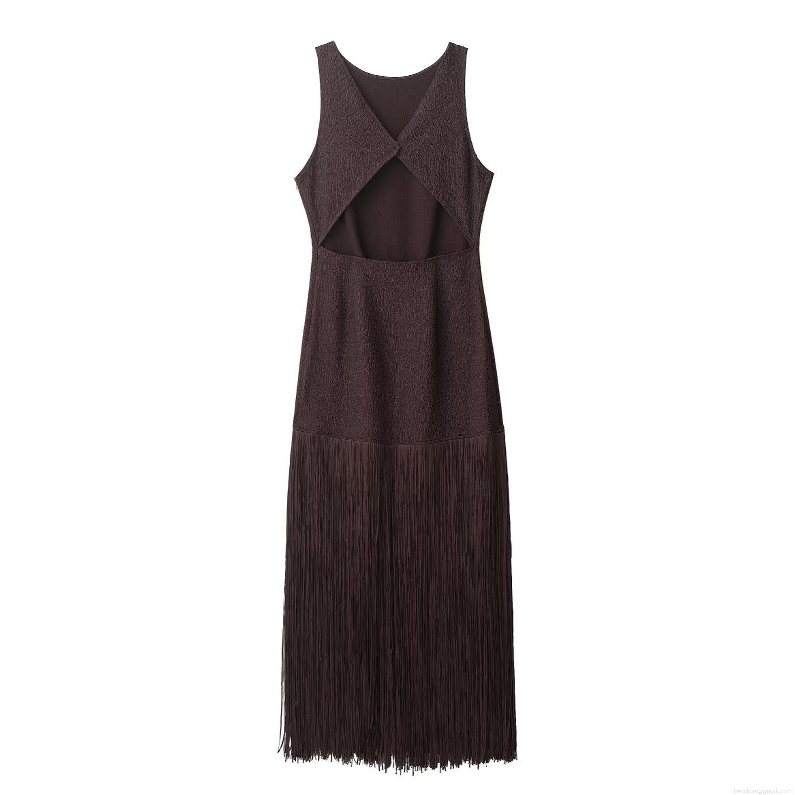 • Women Sexy Backless Fringe Midi Dress Sleeveless Round Neck Textured Slim Fit Tassel Hem Elegant Party Evening Club Bodycon Dresses
