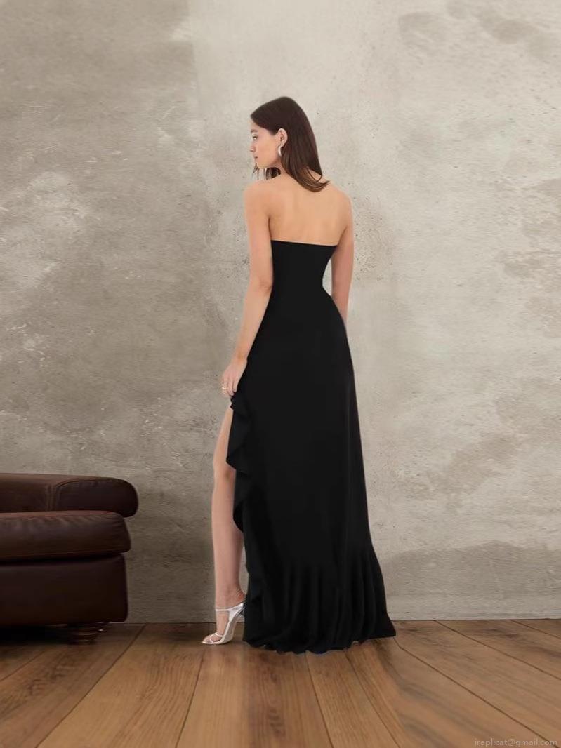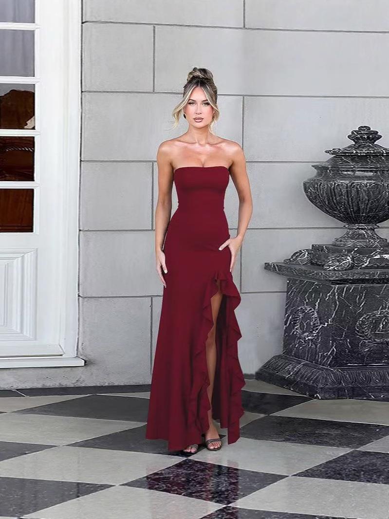 • Women Sexy Bandeau Side Slit Ruffle Evening Maxi Dress Elegant Polyester Elastane Blend Milk Silk Party Gown For Wedding Dinner Banquet