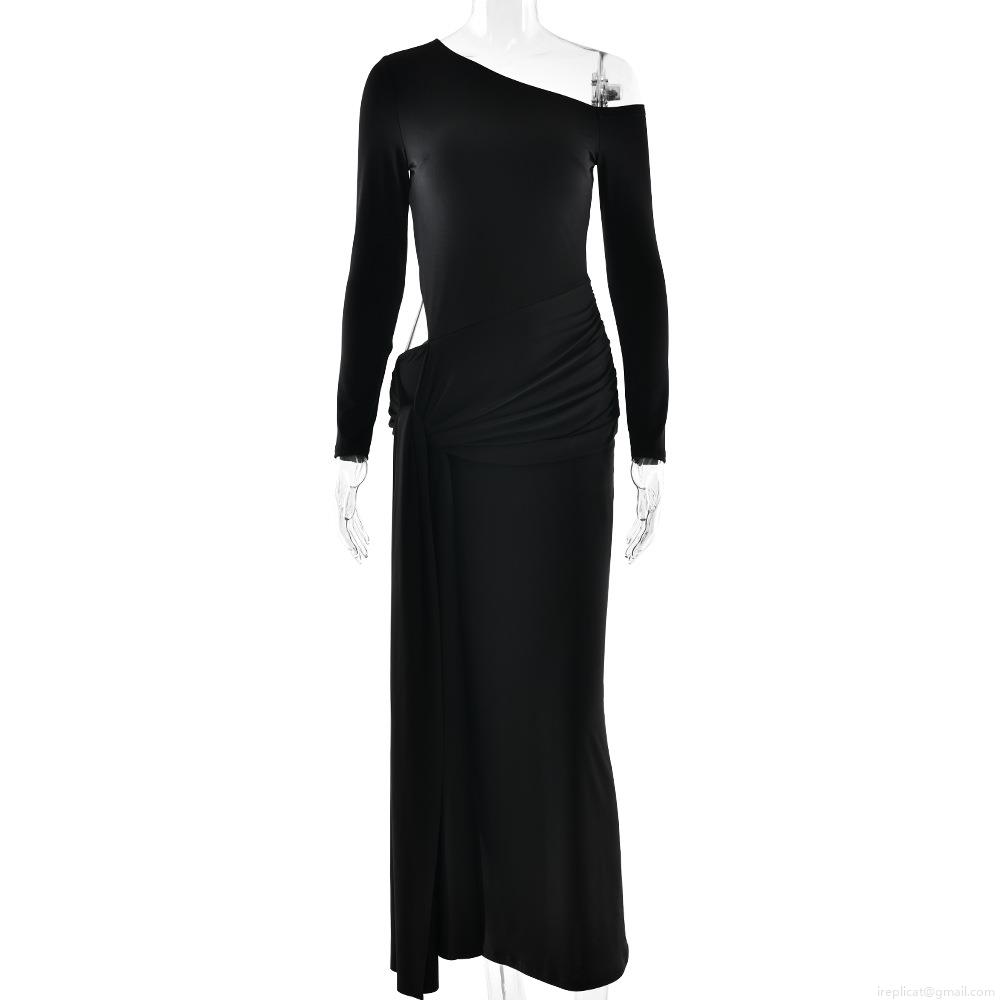 • Women Sexy Cut-Out Waist Long Sleeve Maxi Dress Western Style Asymmetric Neck Twist Knot Ruched Tie Detail Solid Color Evening Party Wear