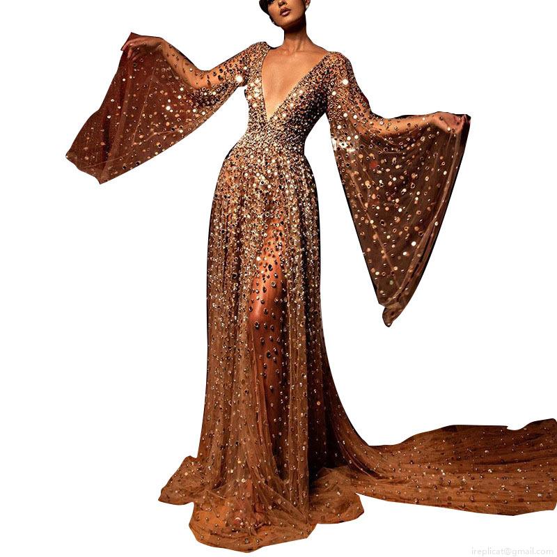 • Women Sexy Deep V Neck Long Sleeve Sequin Maxi Dress Elegant Flare Sleeve Mesh See-through Floor Length Evening Gown For Wedding Party Gala