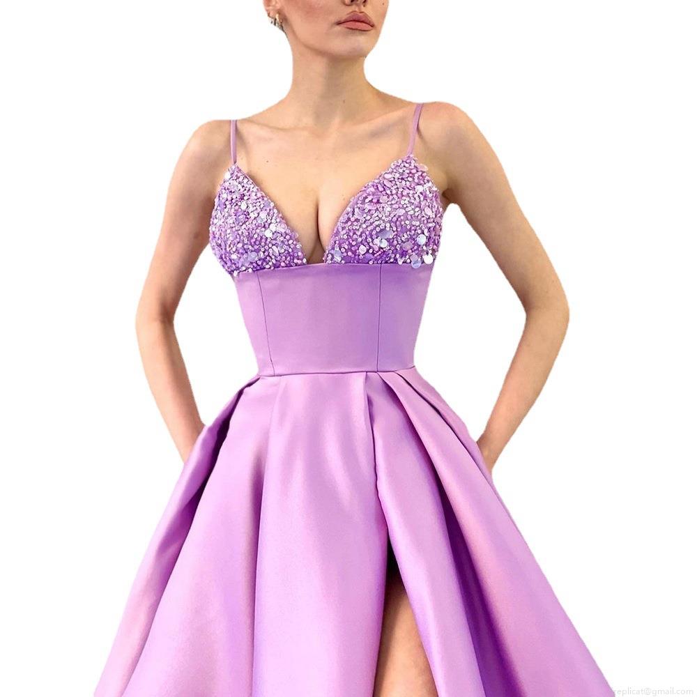 • Women Sexy Deep V Neck Sequin Satin Spliced Evening Dress Elegant Spaghetti Strap High Slit Long Gown For Wedding Party Banquet
