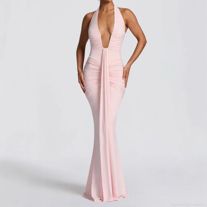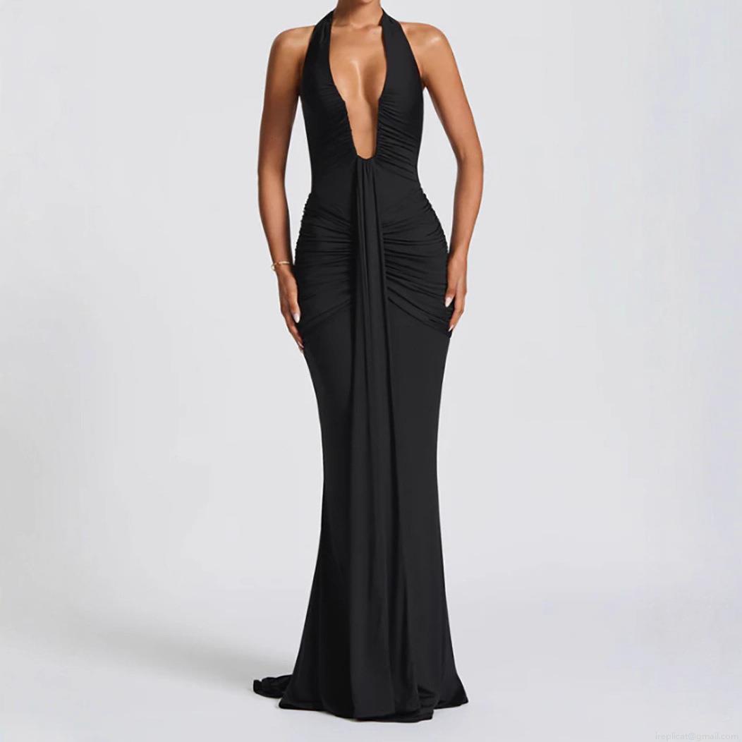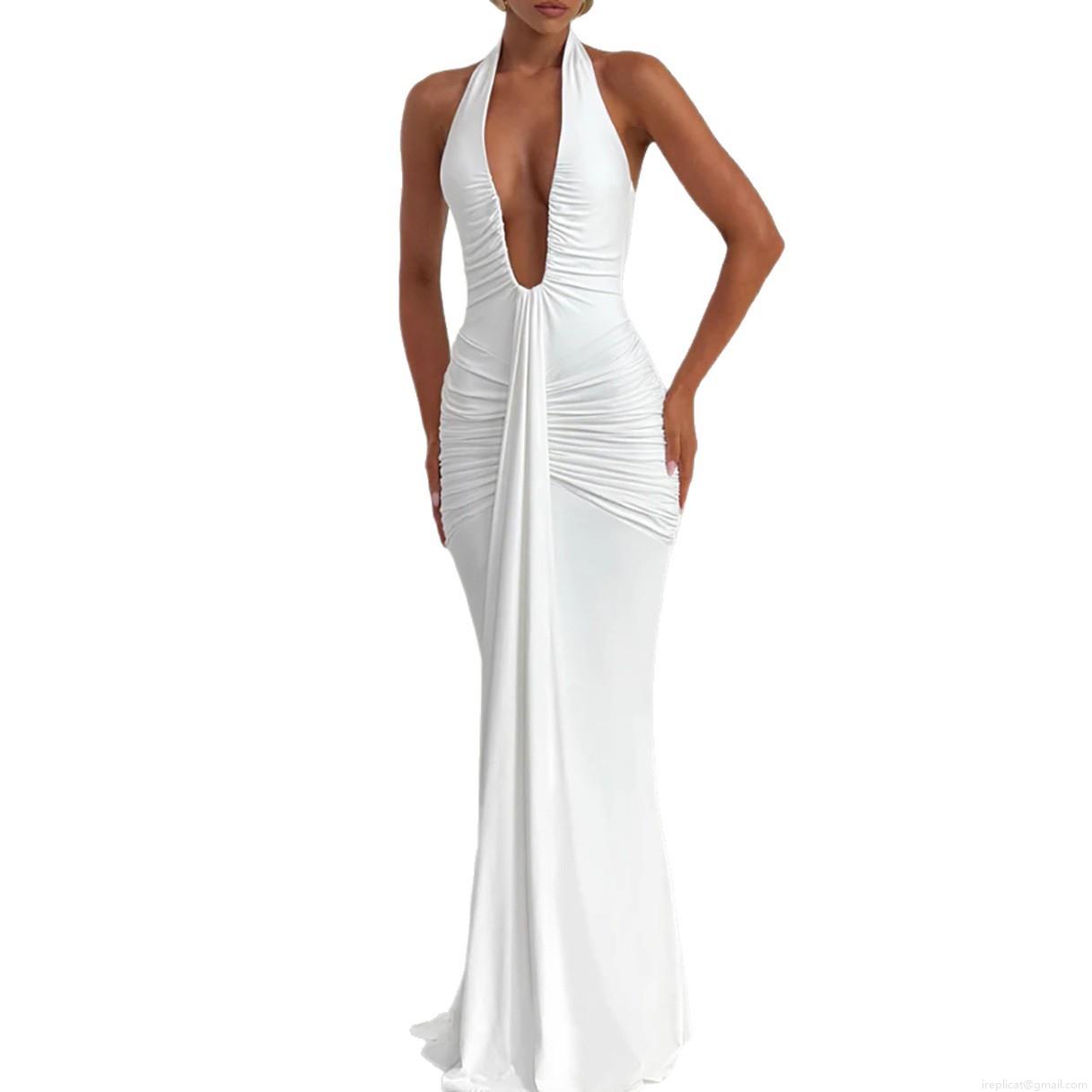 • Women Sexy Halter V-Neck Maxi Dress Elegant Backless Ruched Pleated Bodycon Evening Party Wedding Guest Dress Summer Sleeveless Polyester Floor Length Mermaid Gown