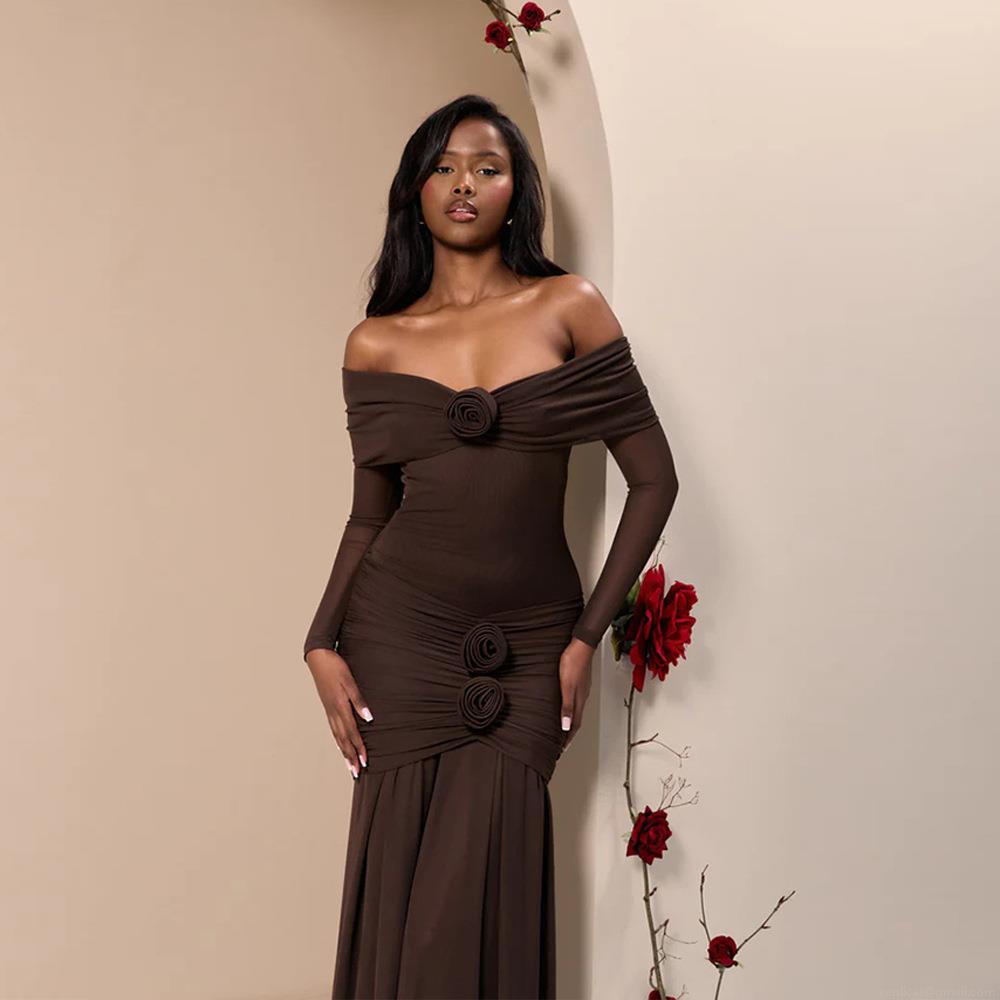 • Women Sexy Off-the-Shoulder Maxi Dress Ruched 3D Rose Flower Long Sleeve Mesh Milk Silk Slim Fit Elegant Evening Party Dress For Women
