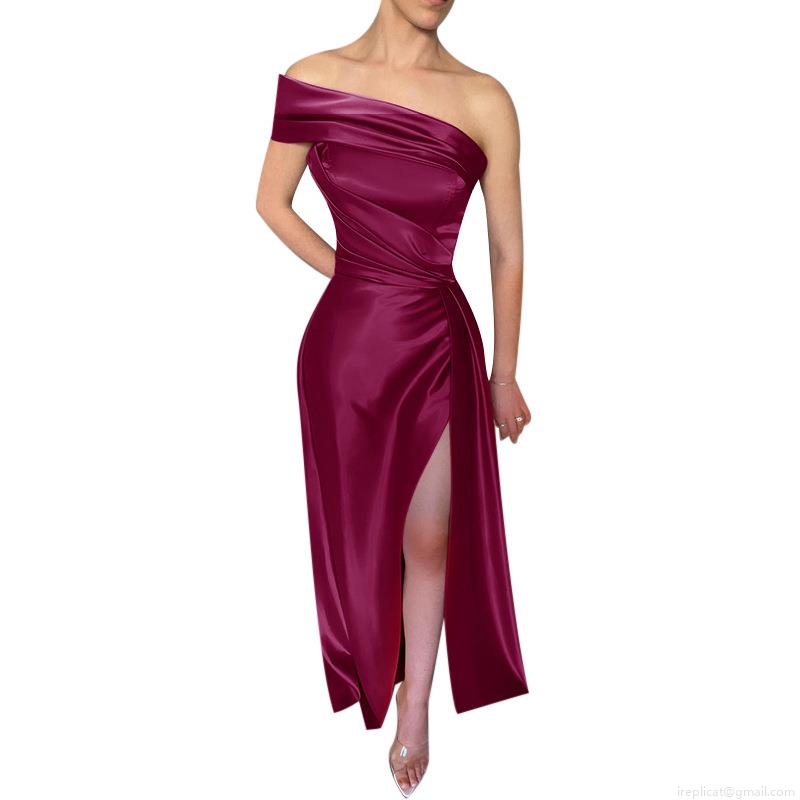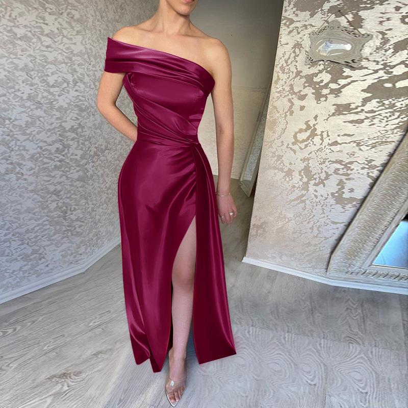 • Women Sexy One Shoulder Satin Maxi Dress Sexy High Slit Ruched Bodycon Evening Party Gown Elegant Western Style Solid Color Floor Length Wedding Guest Dress For Women