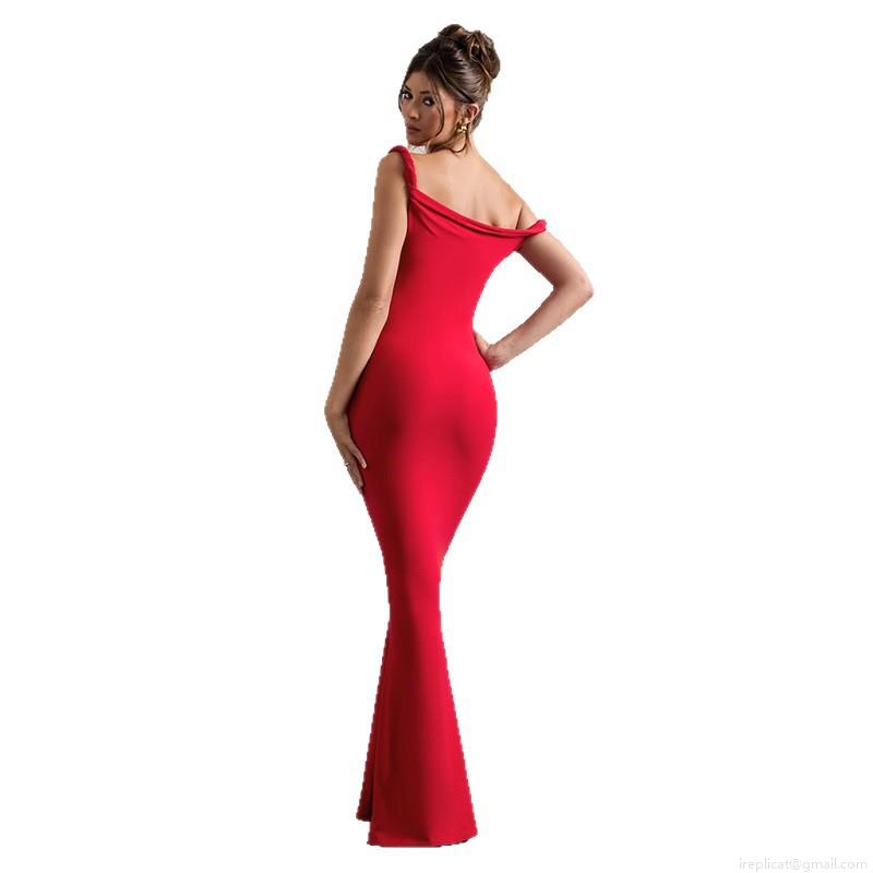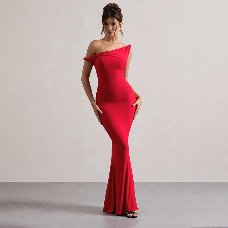 • Women Sexy Red One Shoulder Knot Mermaid Evening Dress Elegant Bodycon Fishtail Maxi Gown For Wedding Party Celebration
