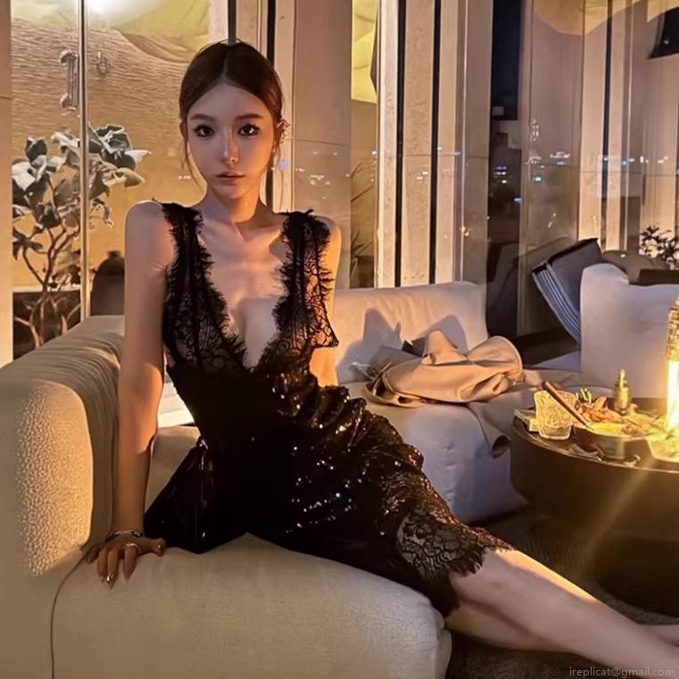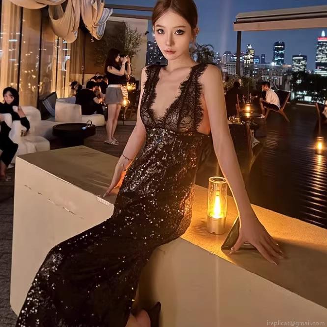 • Women Sexy Sequin Lace Patchwork Maxi Dress Elegant V Neck Sleeveless Bodycon Evening Party Dress For Nightclub Banquet Lady Fashion Dress