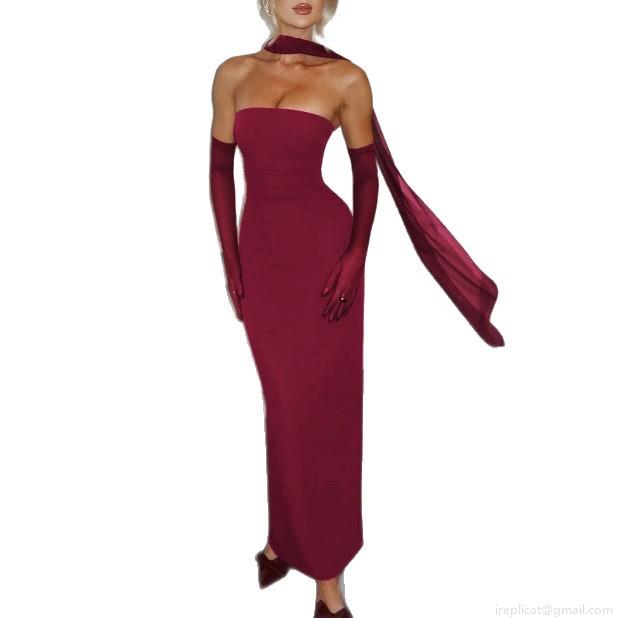 • Women Sexy Strapless Bodycon Maxi Dress Set With Long Gloves And Neck Scarf Solid Color Polyester Spandex Slim Fit Evening Party Gown For Banquet Prom Wedding