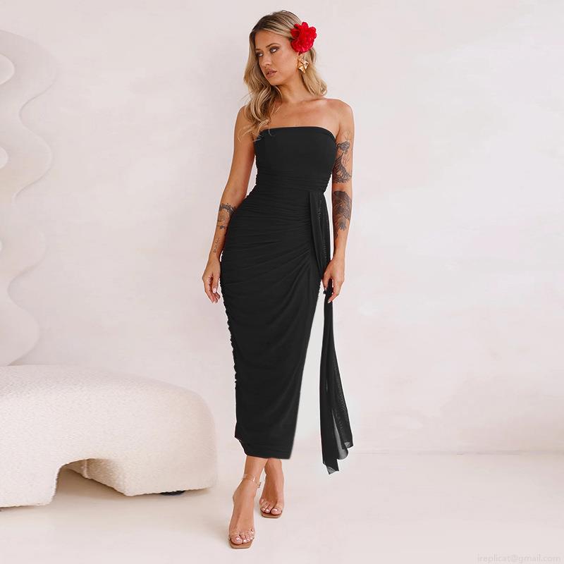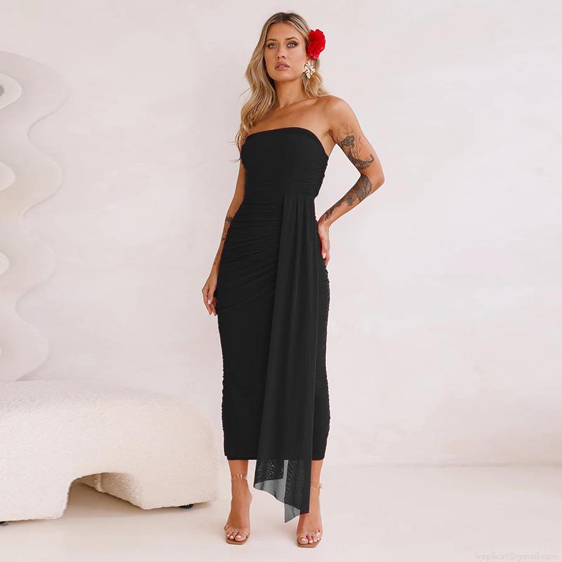 • Women Sexy Strapless Ruched Maxi Dress Elegant Mesh Spliced Bodycon Evening Party Long Dress With Side Drape Polyester Spandex Slim Fit Formal Gown