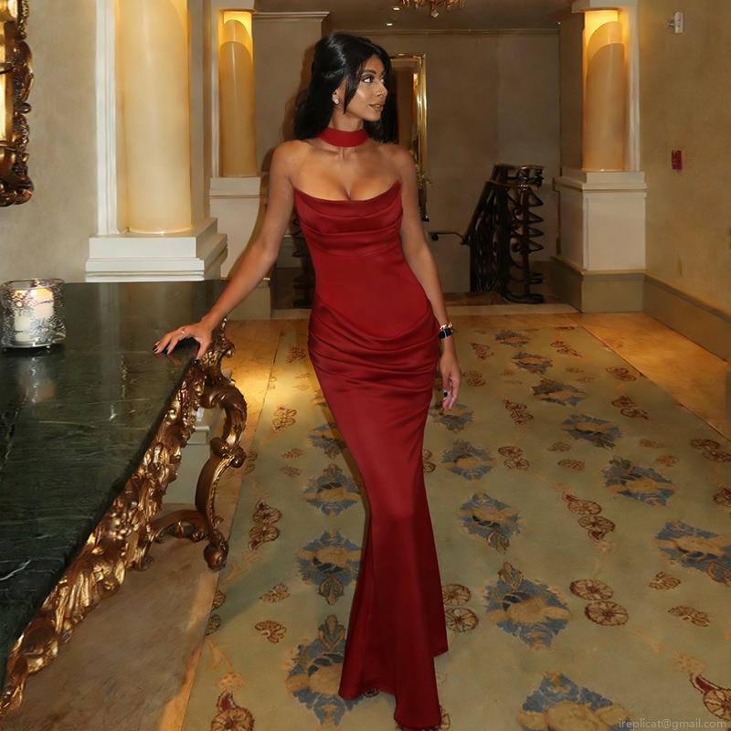 • Women Sexy Wine Red Satin Cowl Neck Evening Dress Ruched Slim Fit Backless Floor Length Formal Party Prom Gown Evening Dress With Choker Neckpiece