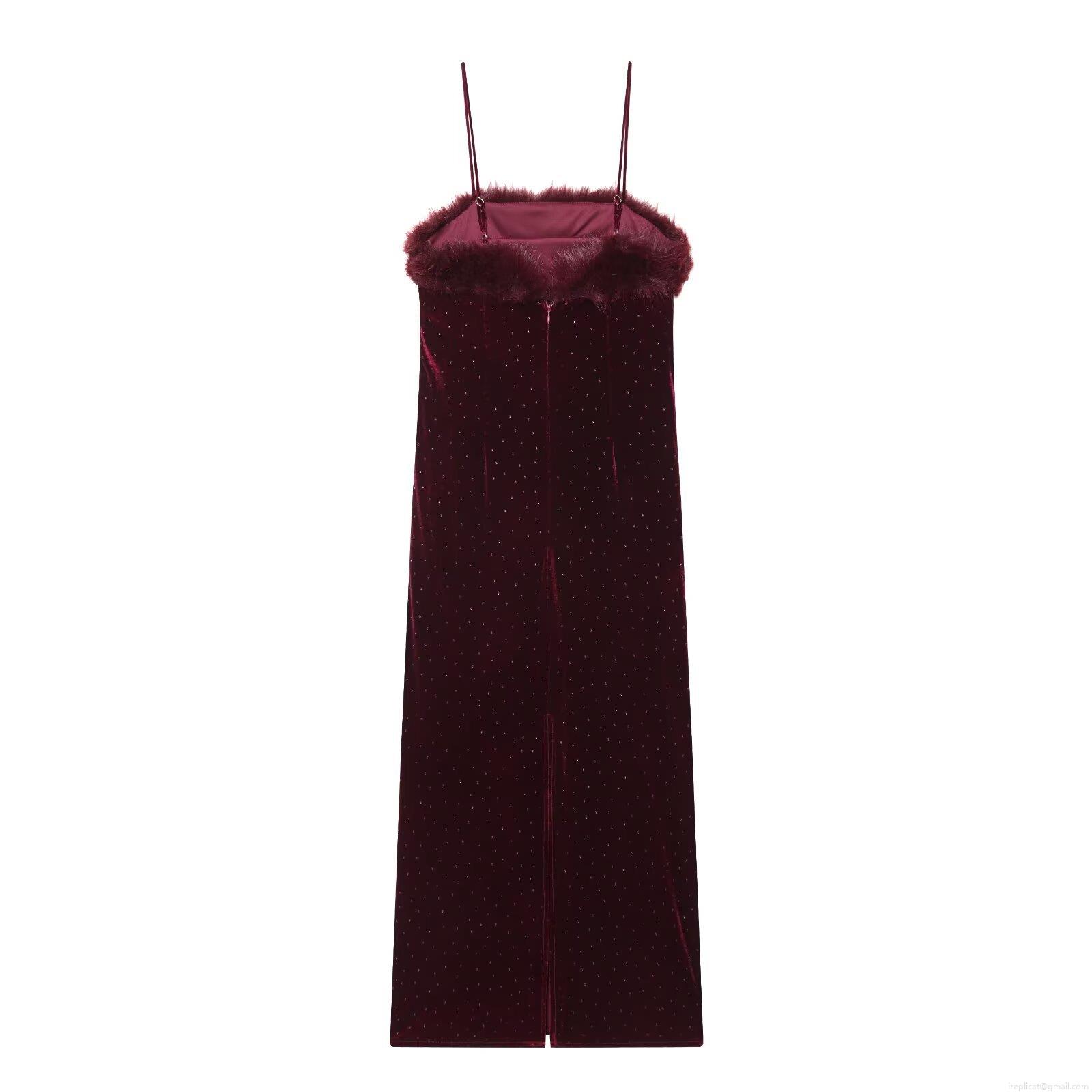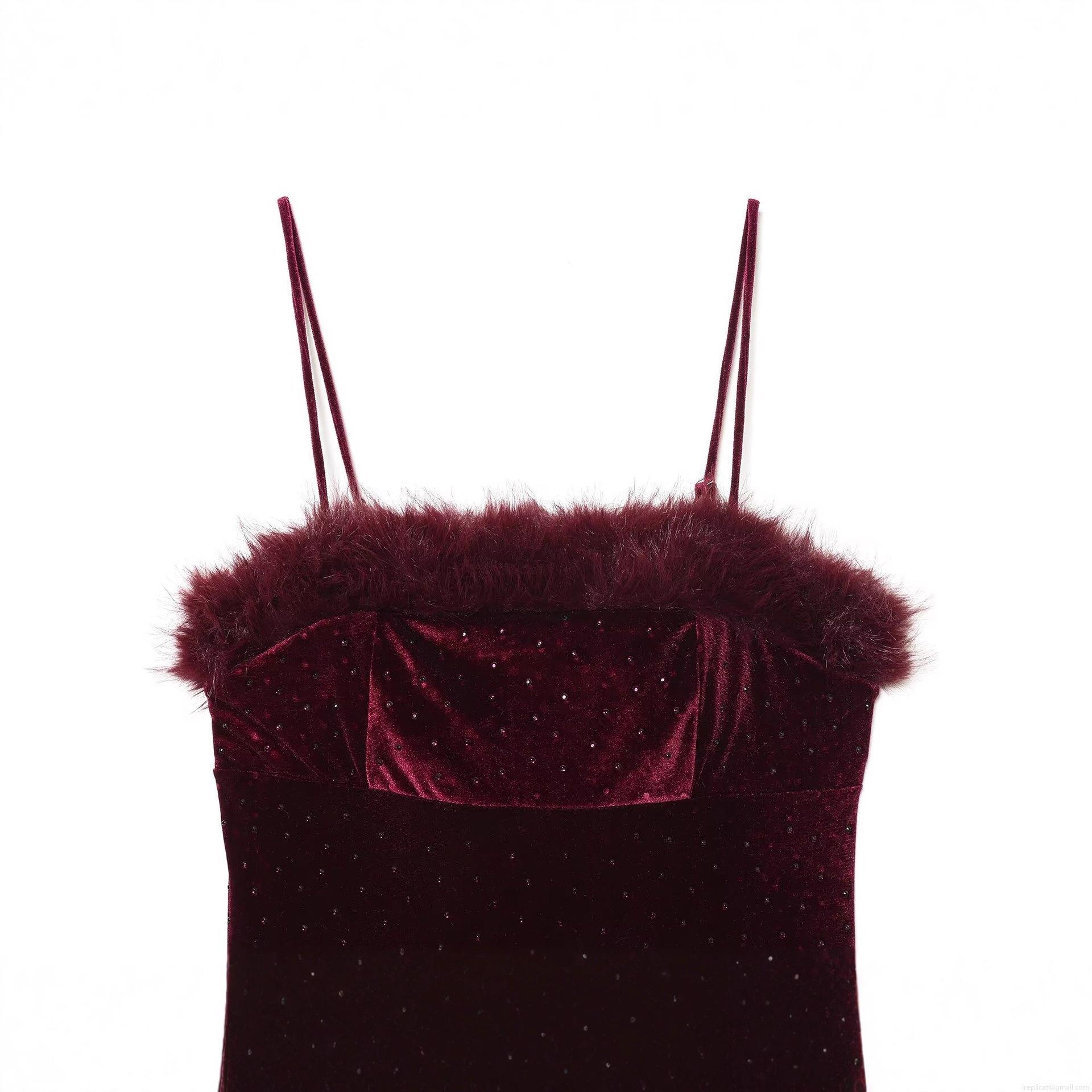 • Women Wine Red Velvet Cami Maxi Dress With Faux Fur Trim Rhinestone Decoration Luxury Spaghetti Strap Party Evening Gown Elegant Slim Fit Banquet Wedding Clothing