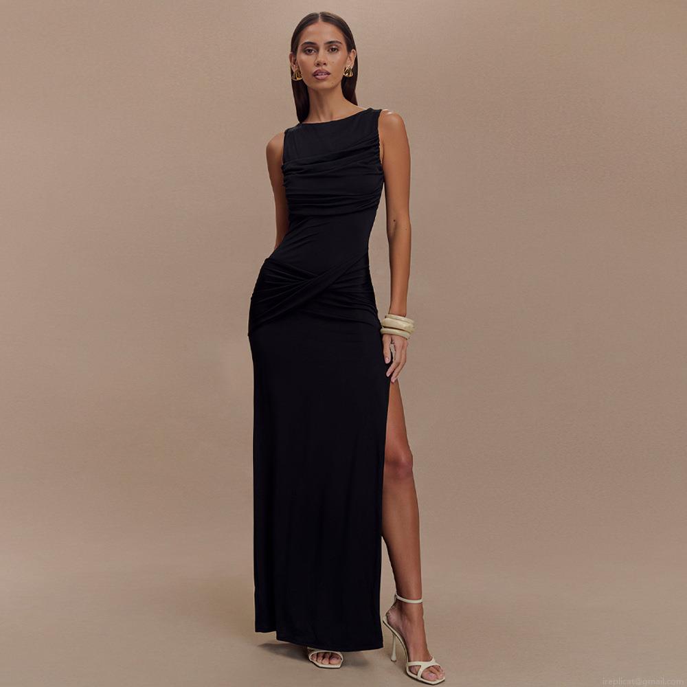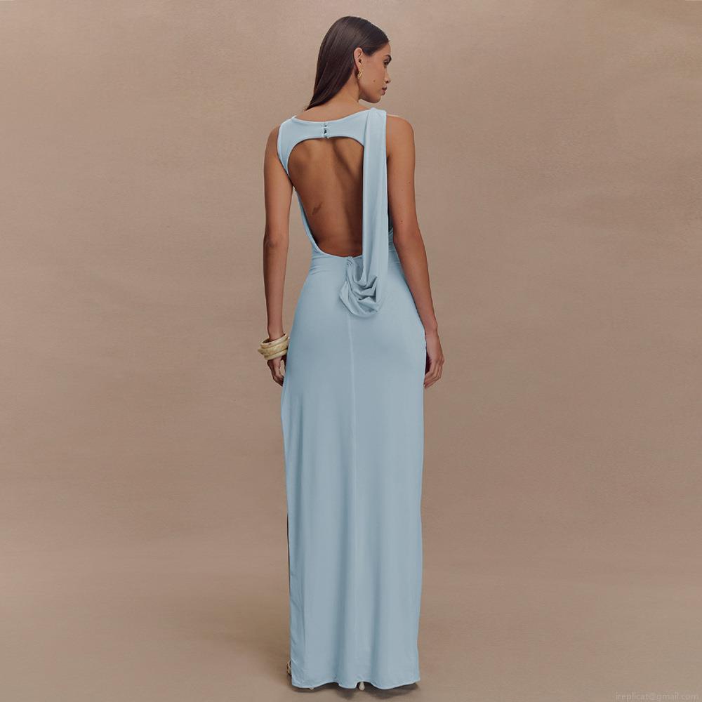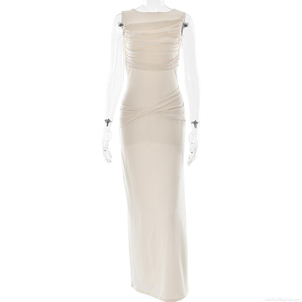 Women's Elegant Backless Maxi Dress Sleeveless Pleated High Slit Slim Fit Milk Silk Party Banquet Evening Dress