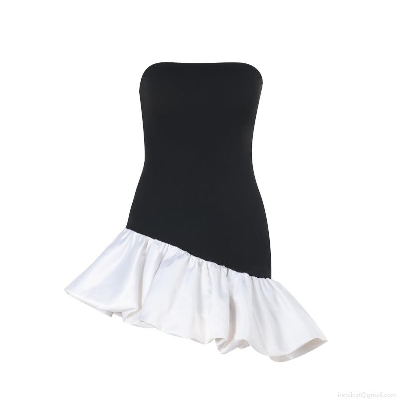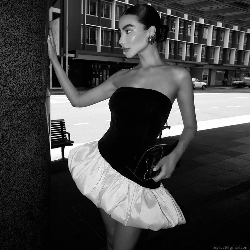 • Women's Elegant Black and White Contrast Strapless Mini Dress Splicing Bubble Hem Evening Party Dress Bodycon High Waist Sleeveless Cocktail Dress