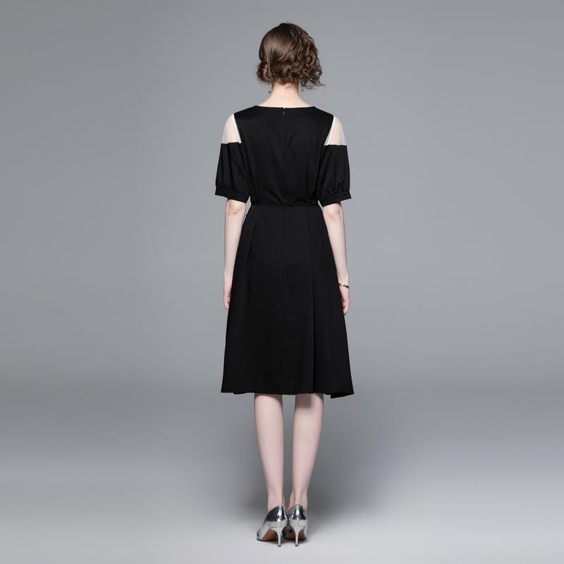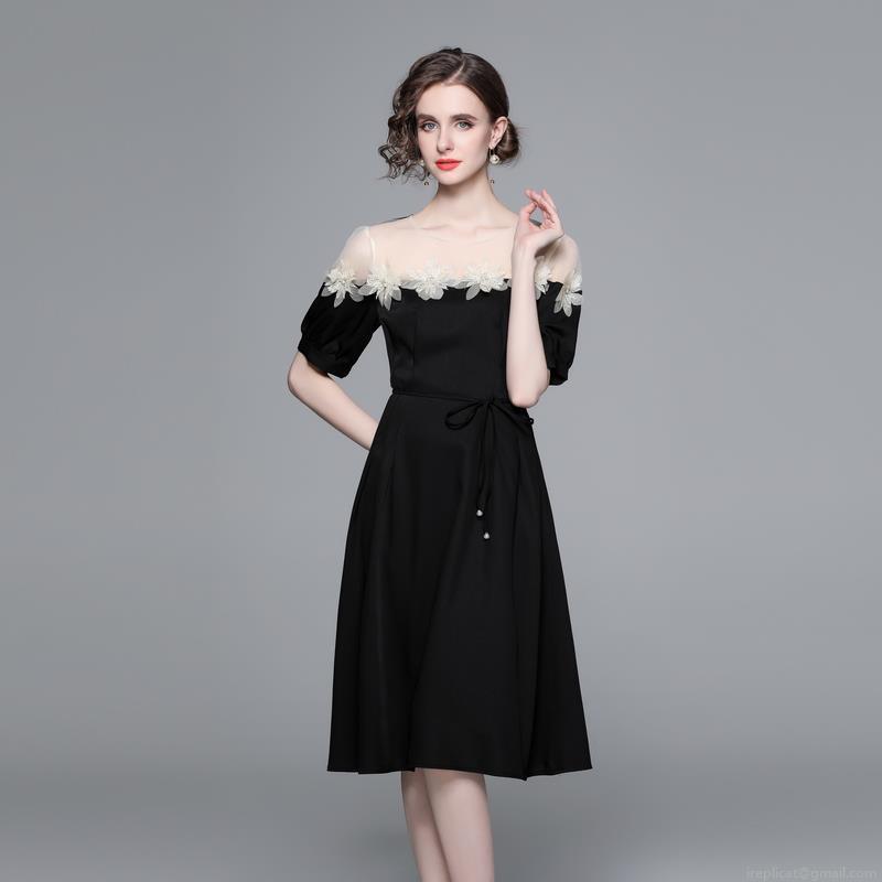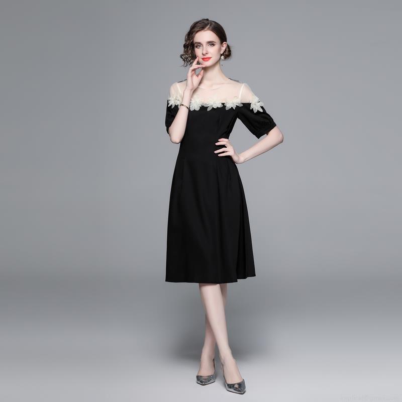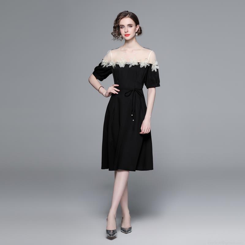 • Women's Elegant French Black Midi Dress Mesh Splicing Lace 3D Floral Applique Short Puff Sleeve High Waist A-Line Swing Party Dress