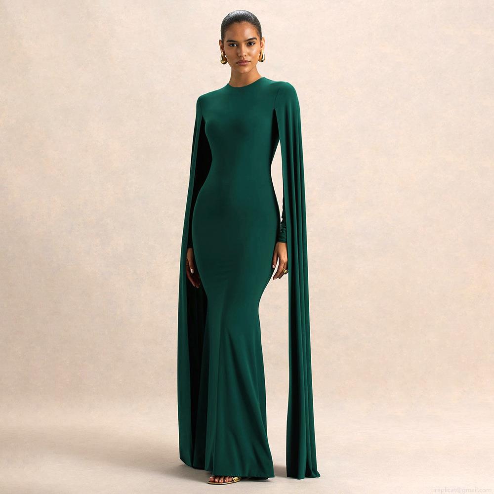 • Women's Elegant Green Mermaid Evening Dress Sexy Cape Sleeve Slit Maxi Gown Slim Fit Milk Silk Formal Dress for Party Banquet