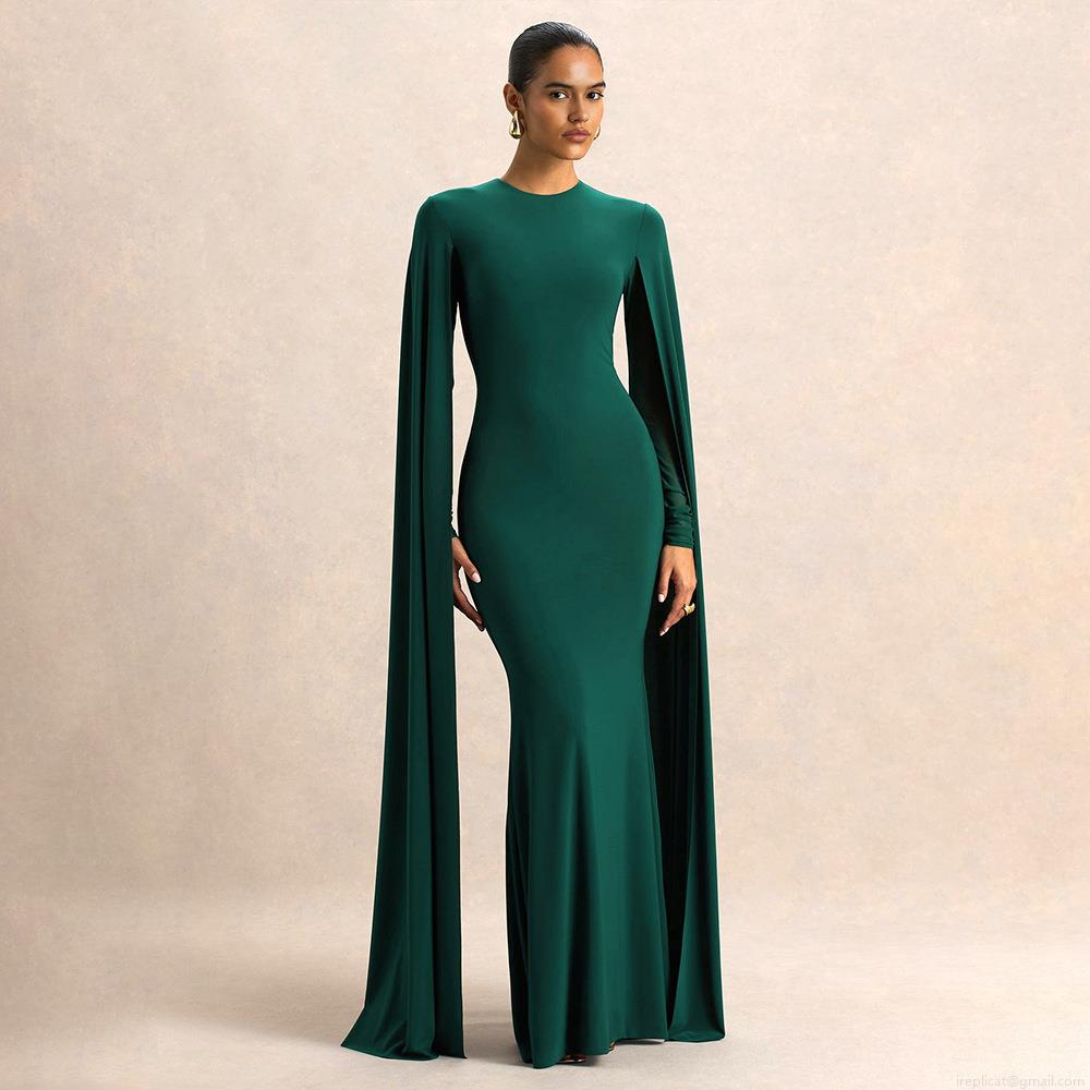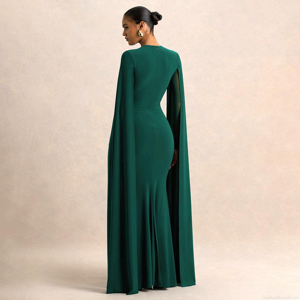 Women's Elegant Green Mermaid Evening Dress Sexy Cape Sleeve Slit Maxi Gown Slim Fit Milk Silk Formal Dress for Party Banquet