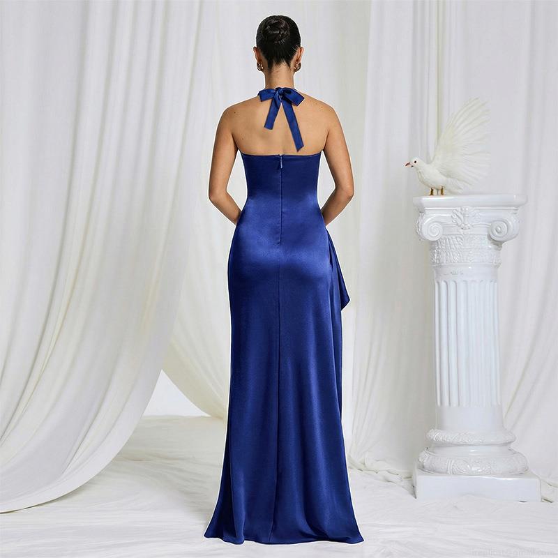 • Women's Elegant Halter Neck Satin Evening Dress Sexy High Slit Floor Length Gown Backless Ruched Party Dress for Wedding Banquet Celebration