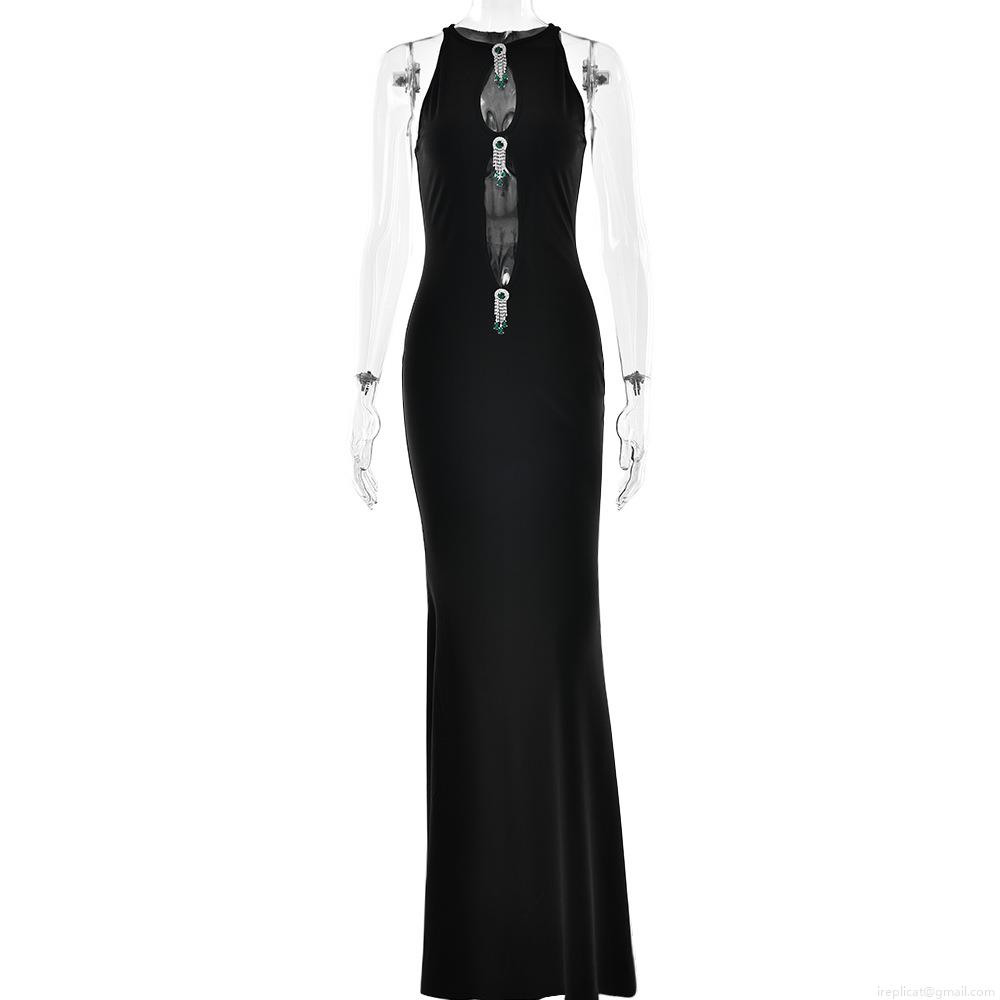 • Women's Elegant Hollow Out Halter Maxi Dress With Detachable Green Jewelry Ornaments Slim Fit Mermaid Evening Party Long Gown