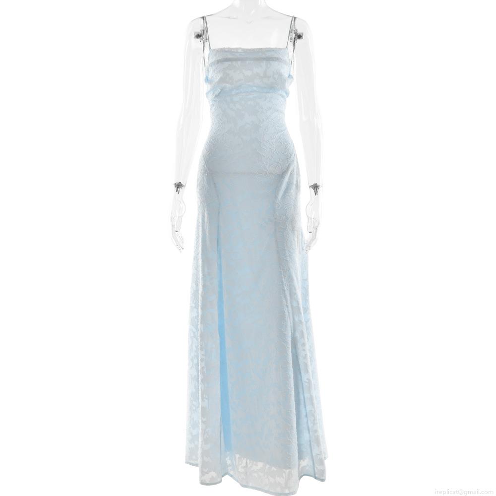 • Women's Elegant Jacquard Chiffon Maxi Dress Sexy Backless Spaghetti Strap Evening Gown For Wedding Party Banquet Summer Floor Length Dress