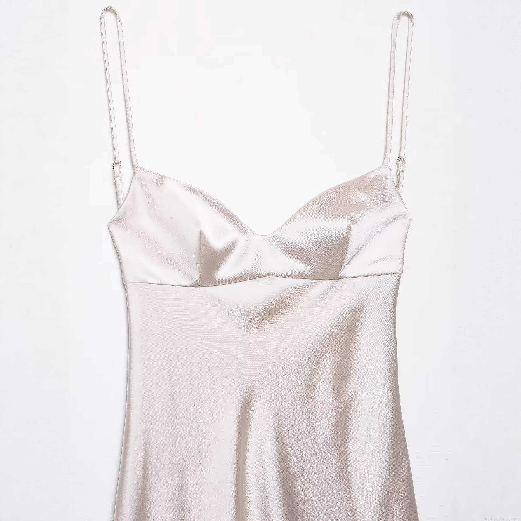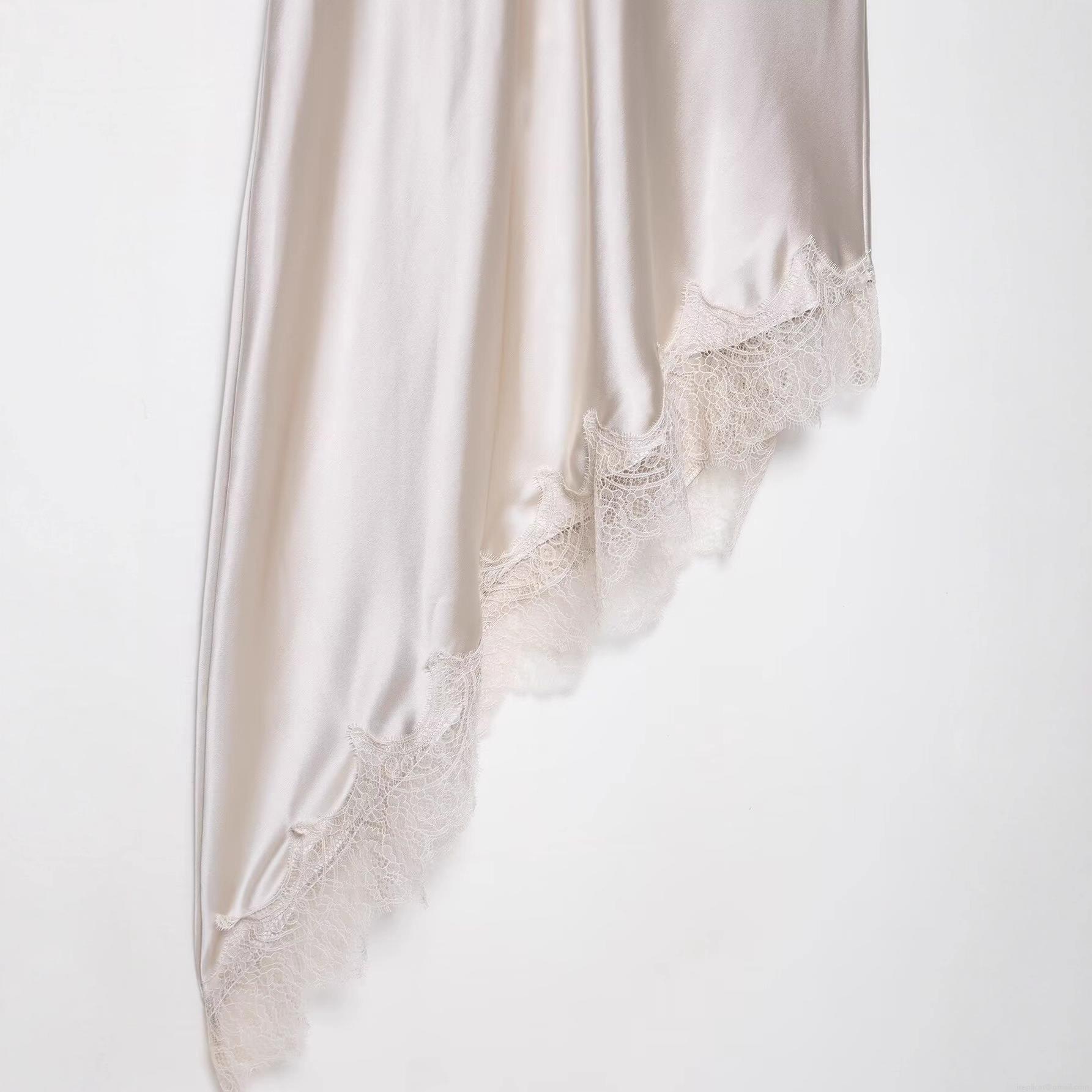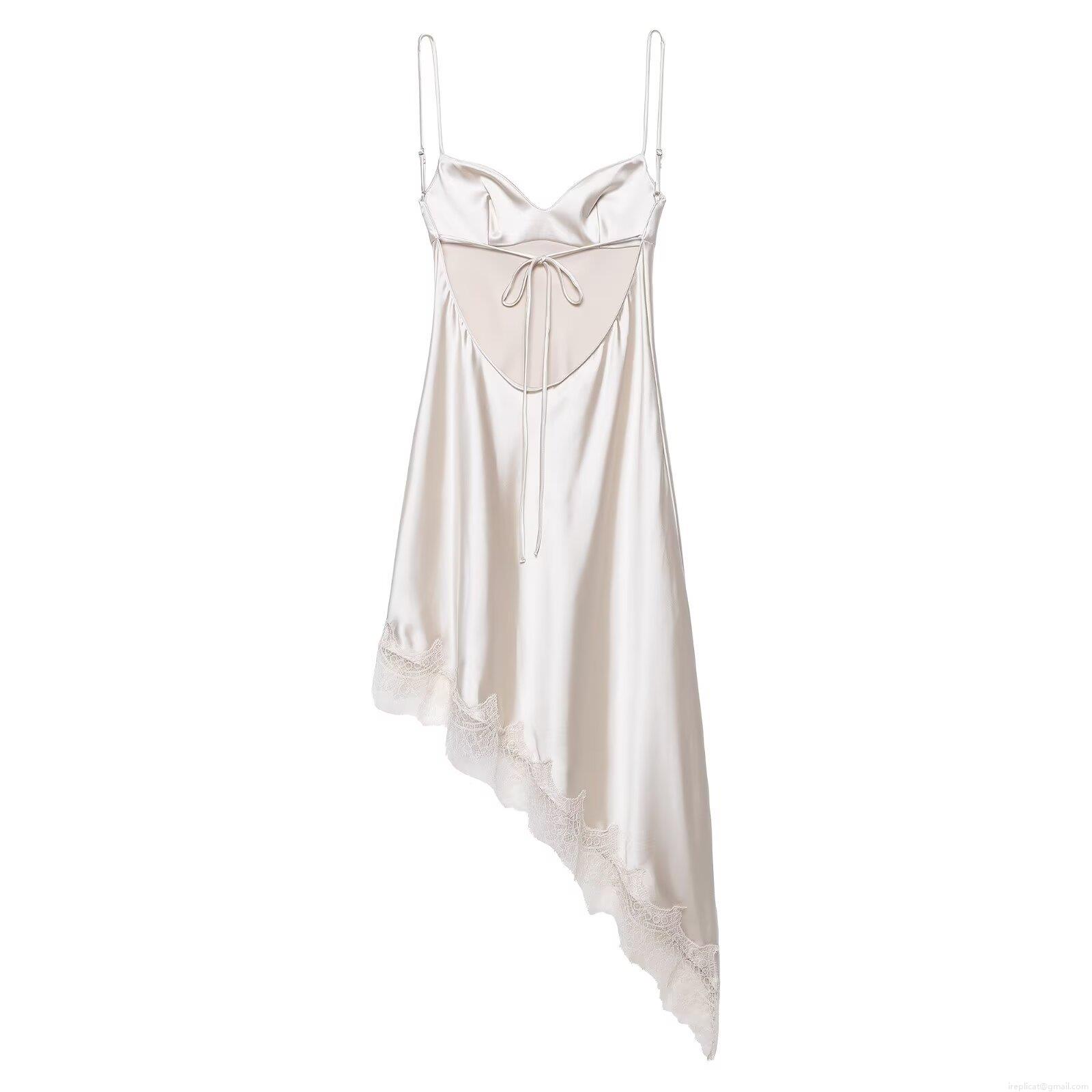• Women's Elegant Satin Slip Dress With Lace Trim Backless V-Neck Asymmetric Hem Spaghetti Strap Champagne Party Maxi Dress