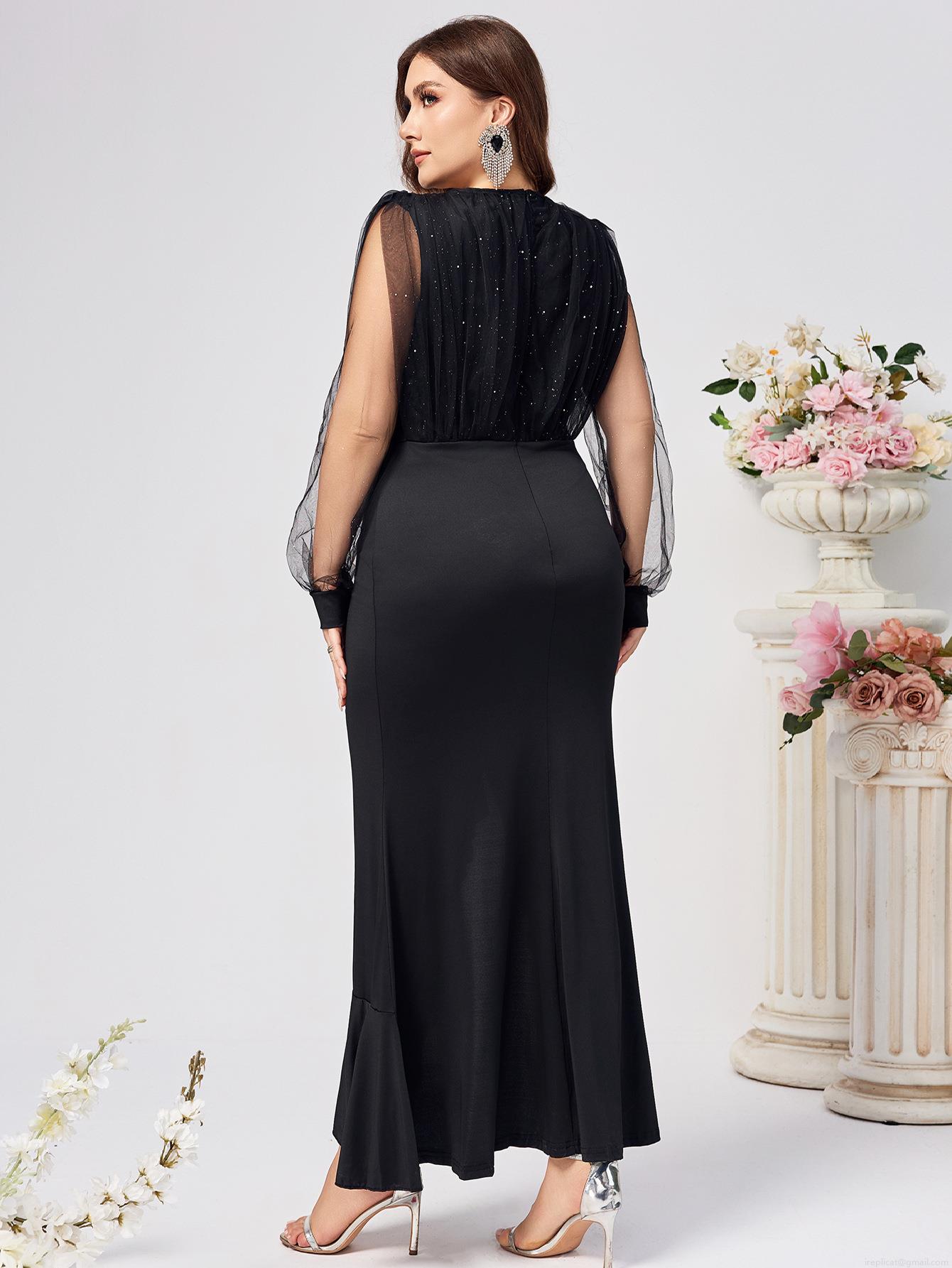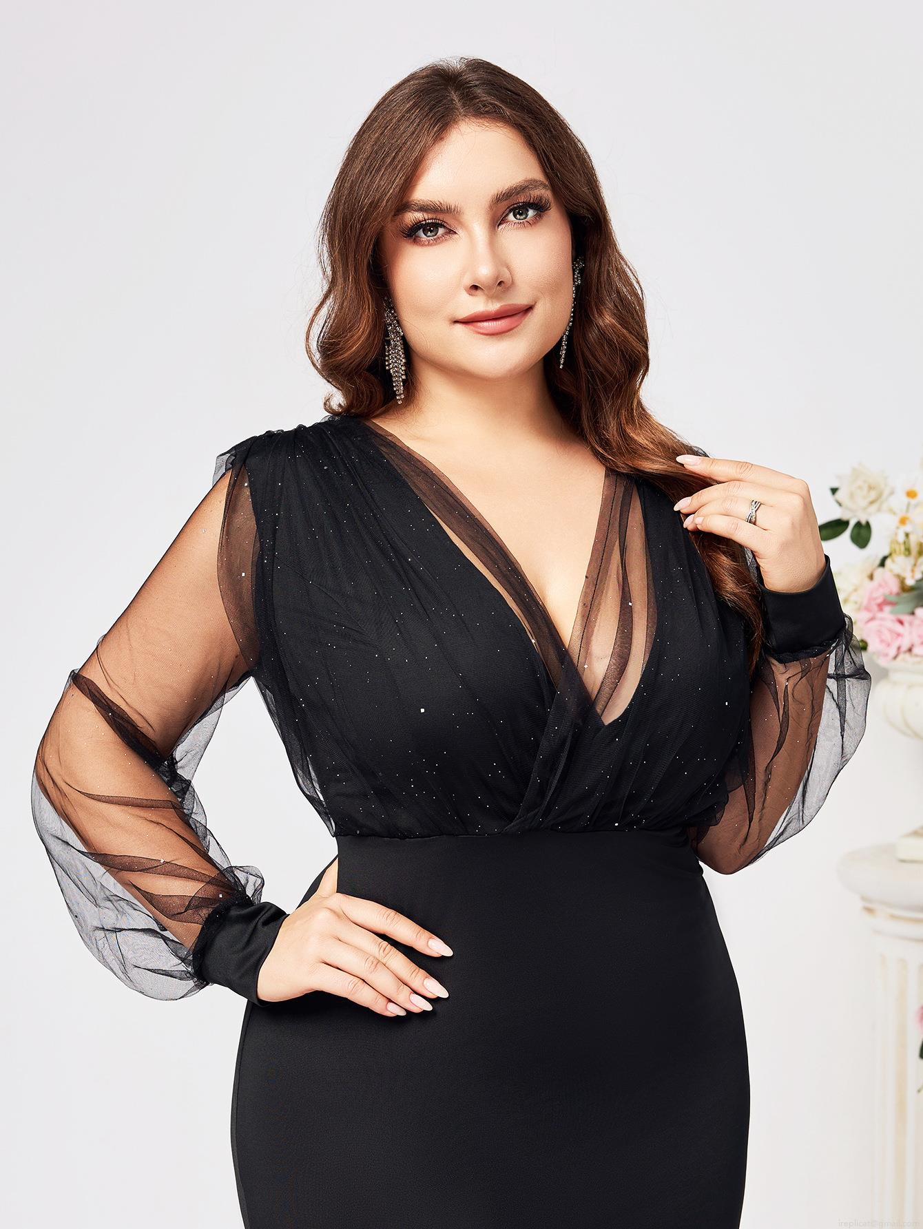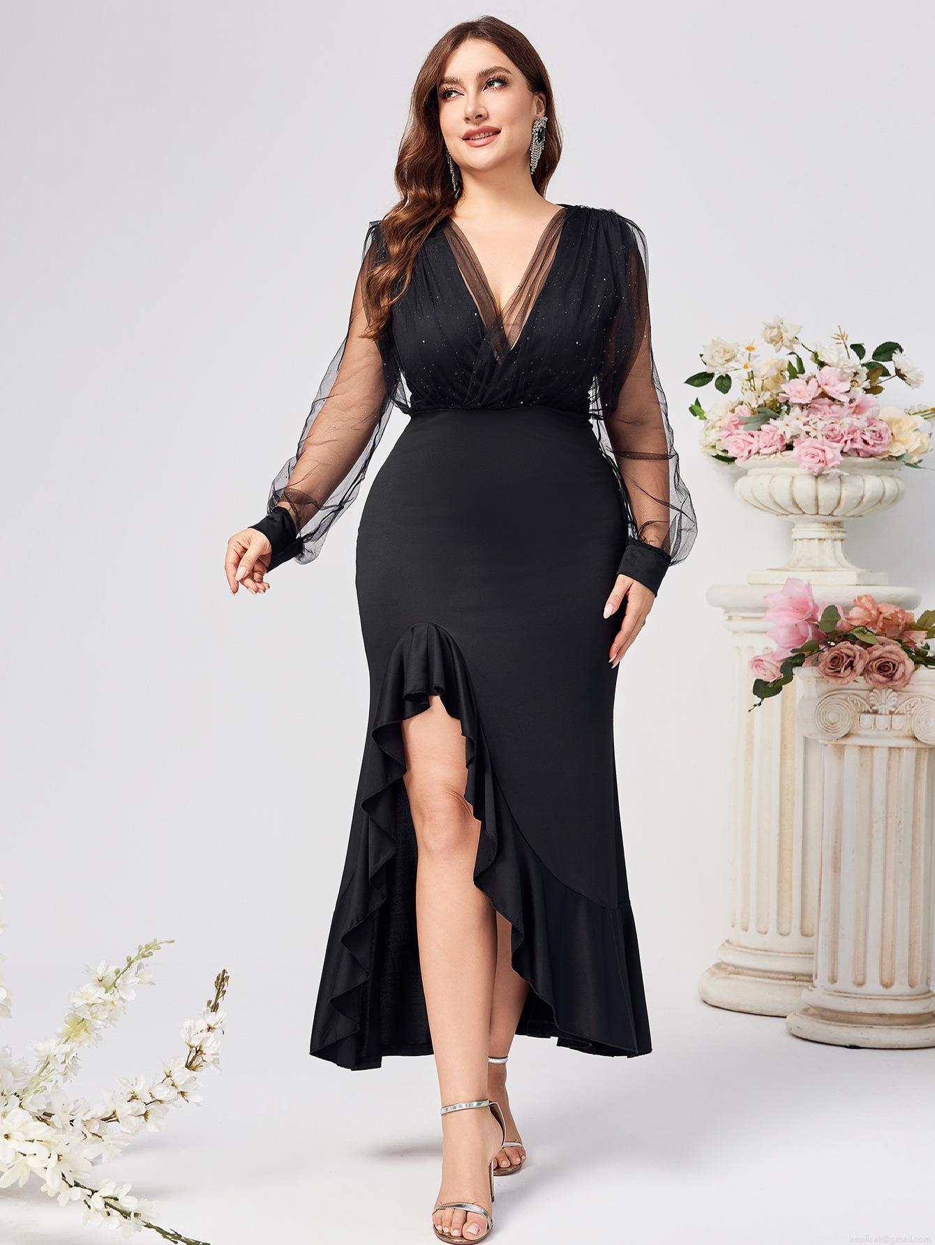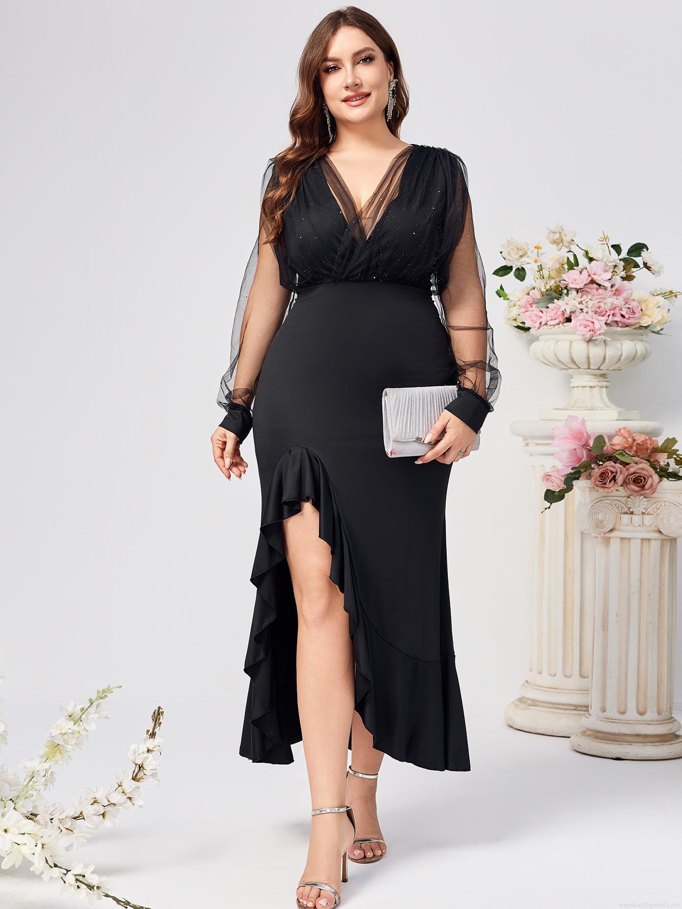• Women's Elegant V Neck Evening Dress Mesh Long Sleeves With Glitter Asymmetrical Ruffle Hem High Slit Formal Party Gala Dress Wedding Guest Gown