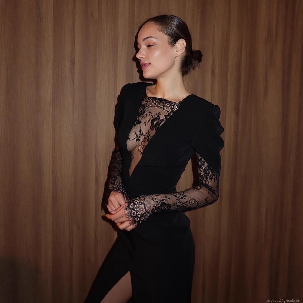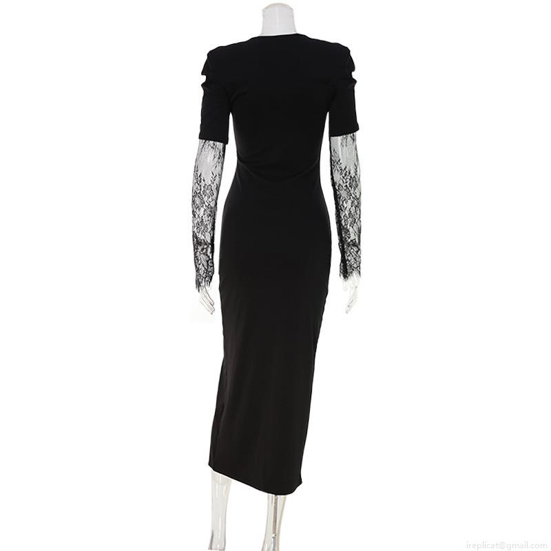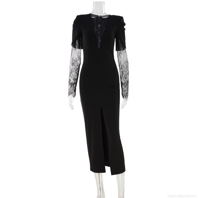 • Women's Elegant V-Neck Long Sleeve Dress With Black Lace Patchwork High Slit Slim Fit Bodycon Evening Party Long Midi Dress For Autumn Winter