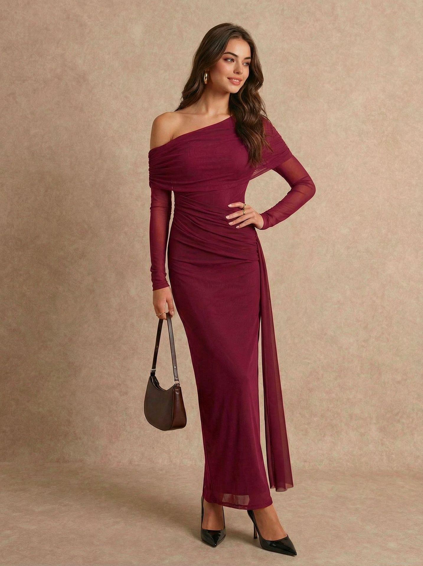 • Women's Elegant Wine Red Evening Dress One Shoulder Mesh Long Sleeve Ruched Slim Fit Polyester Maxi Gown For Banquet Party Wedding Guest