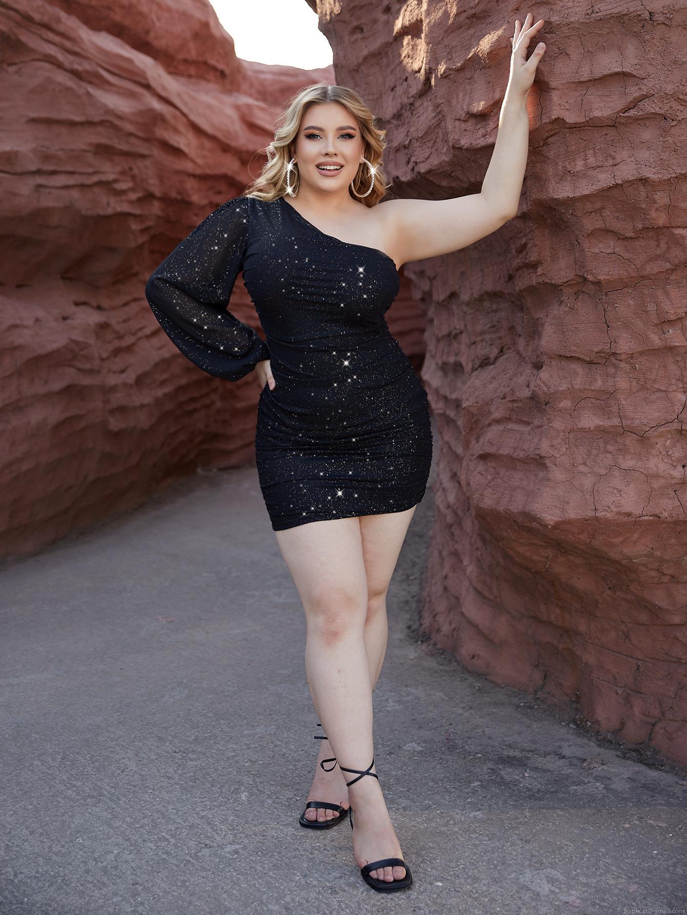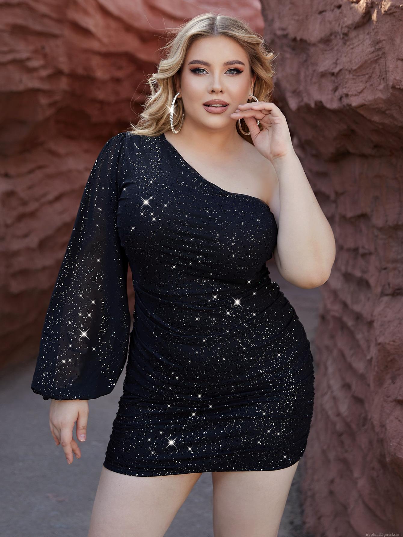 • Women's Plus Size One-Shoulder Sequin Party Dress Sexy Long Sleeve Pleated Bodycon Mini Dress For Night Out Clubwear Wedding Celebration