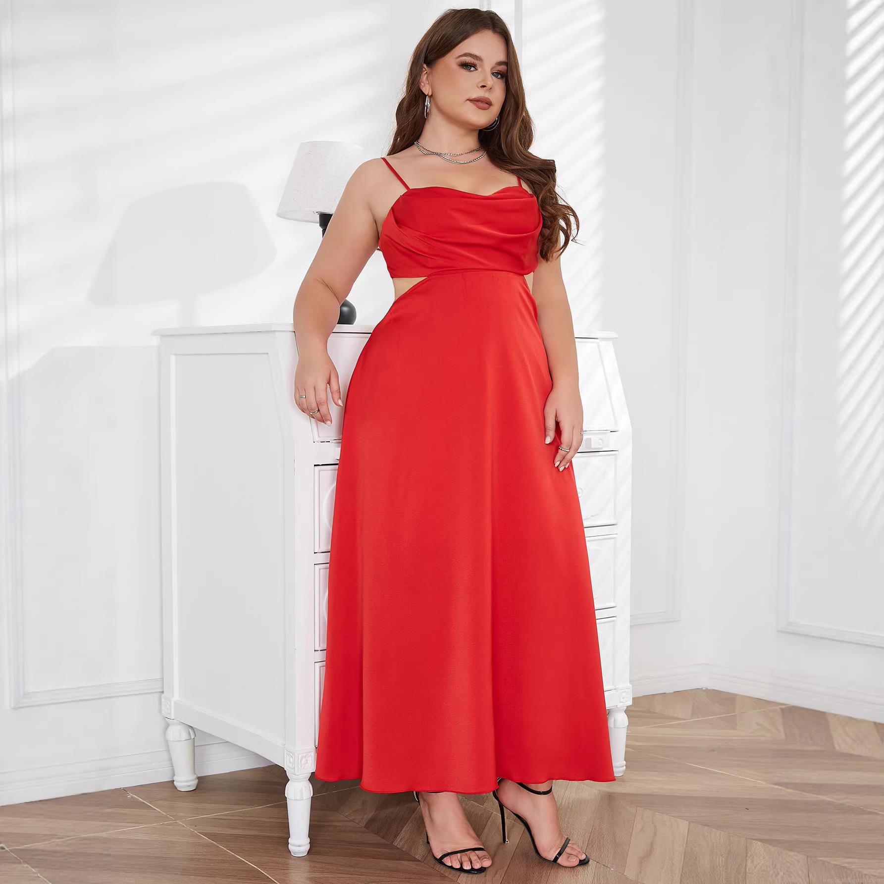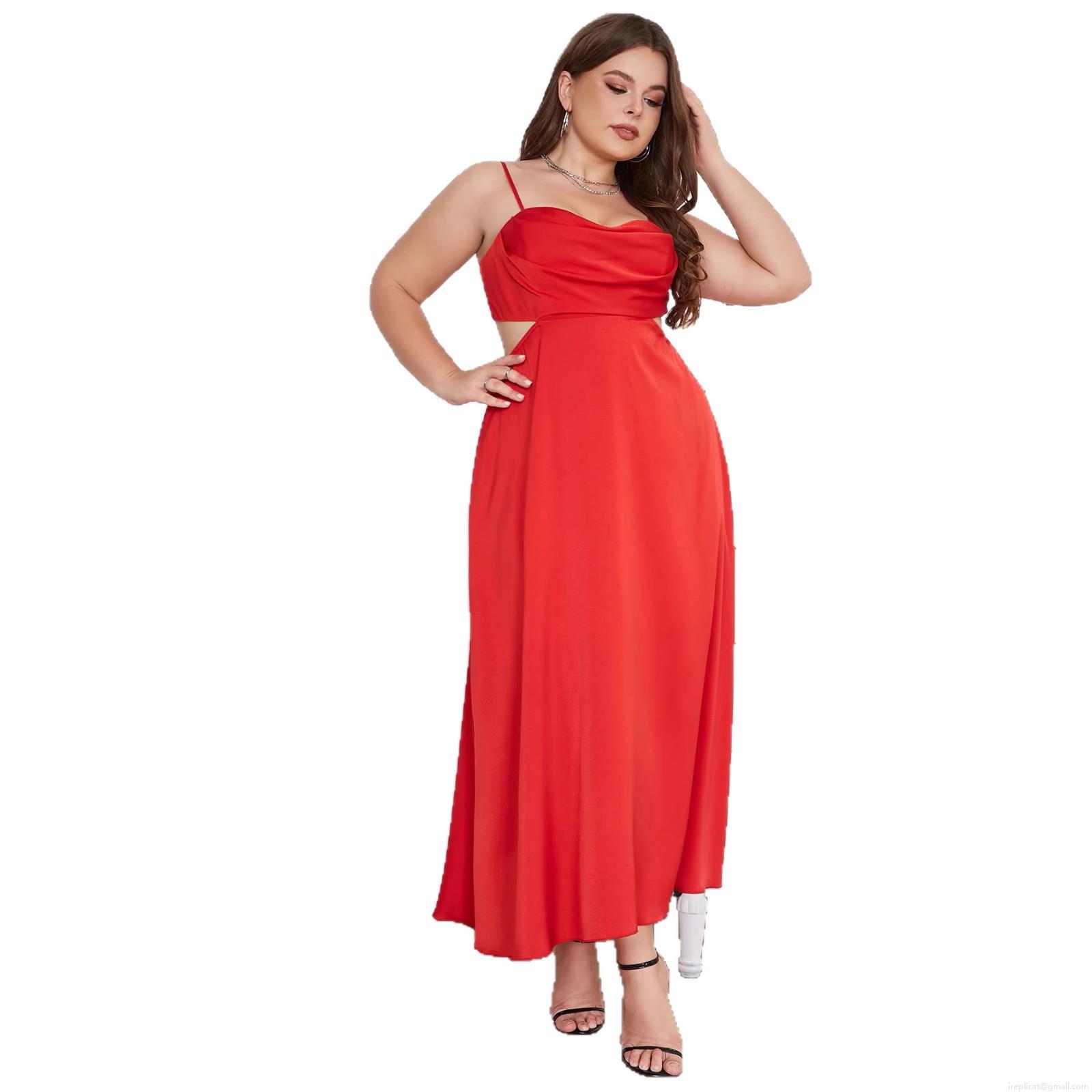 • Women's Plus Size Red Satin Cami Dress Sexy Hollow Out Backless Cowl Neck Midi Evening Party Dress Sleeveless Elegant Bodycon Dress