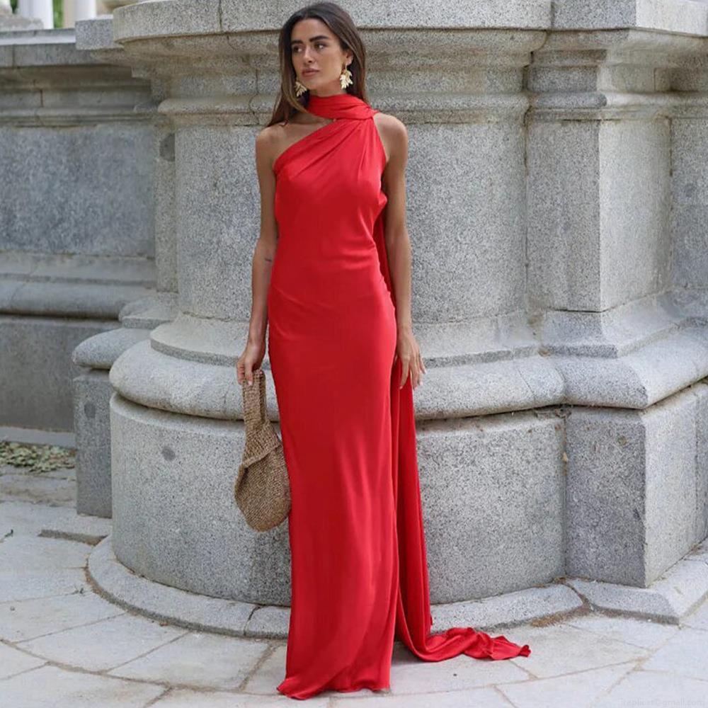 Women's Satin Backless Halter Maxi Dress Sexy Single Shoulder Evening Gown With Streamer Long Ribbon Party Dress For Women Slim Fit Wedding Guest Outfit
