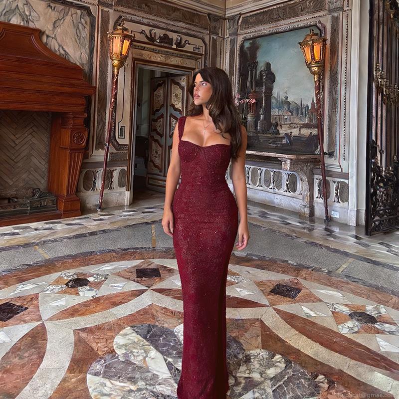 • Women's Sequin Evening Dress Sexy Spaghetti Strap Square Neck Slim Fit High Slit Long Maxi Dress For Party Banquet Wedding Elegant French Style