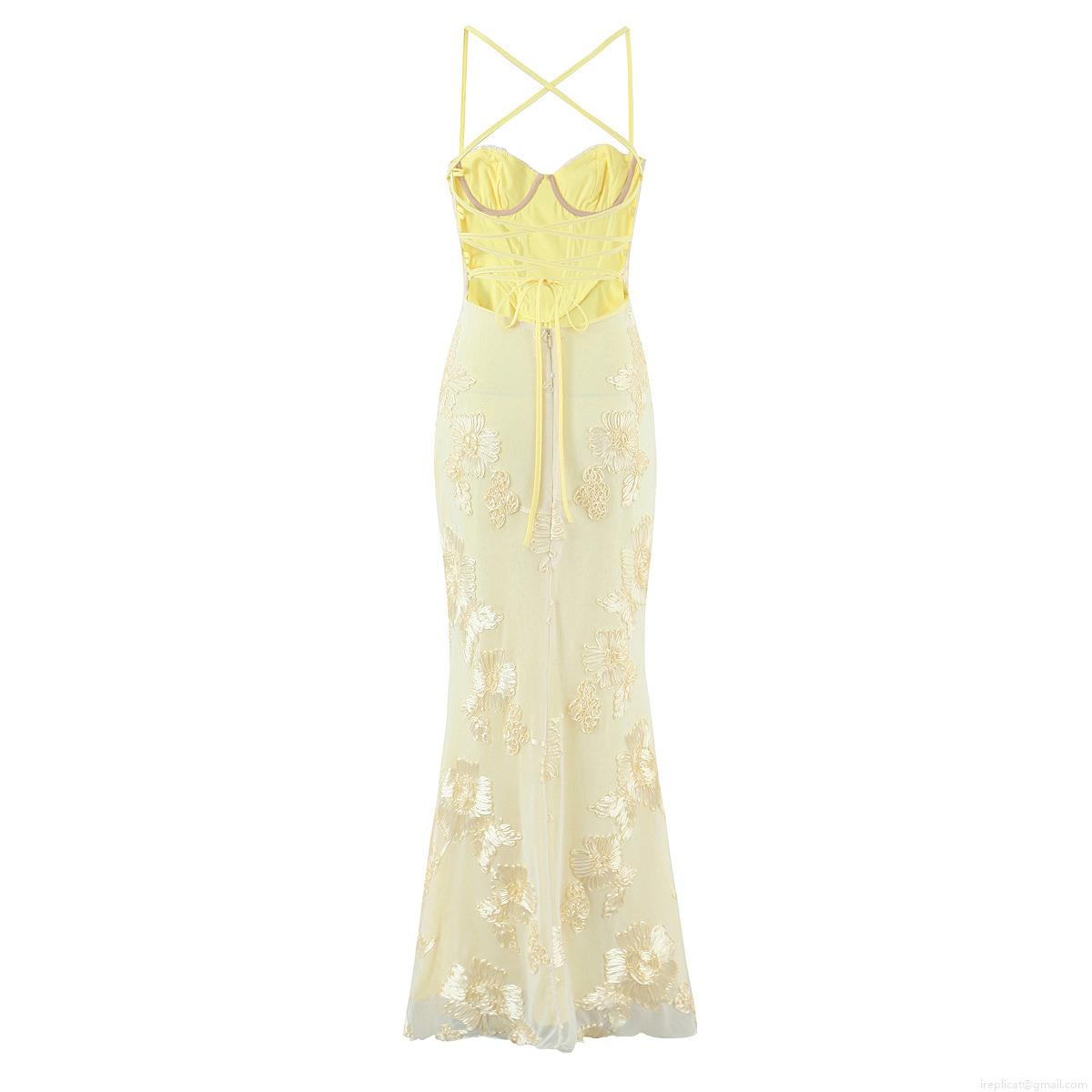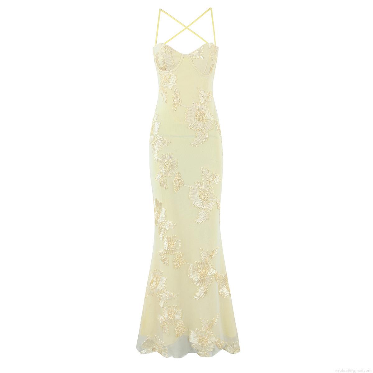 Women's Sexy 3D Floral Applique Maxi Dress Cross Strap Backless Fish Tail Evening Gown Elegant Bodycon Lace Embroidery Party Dress