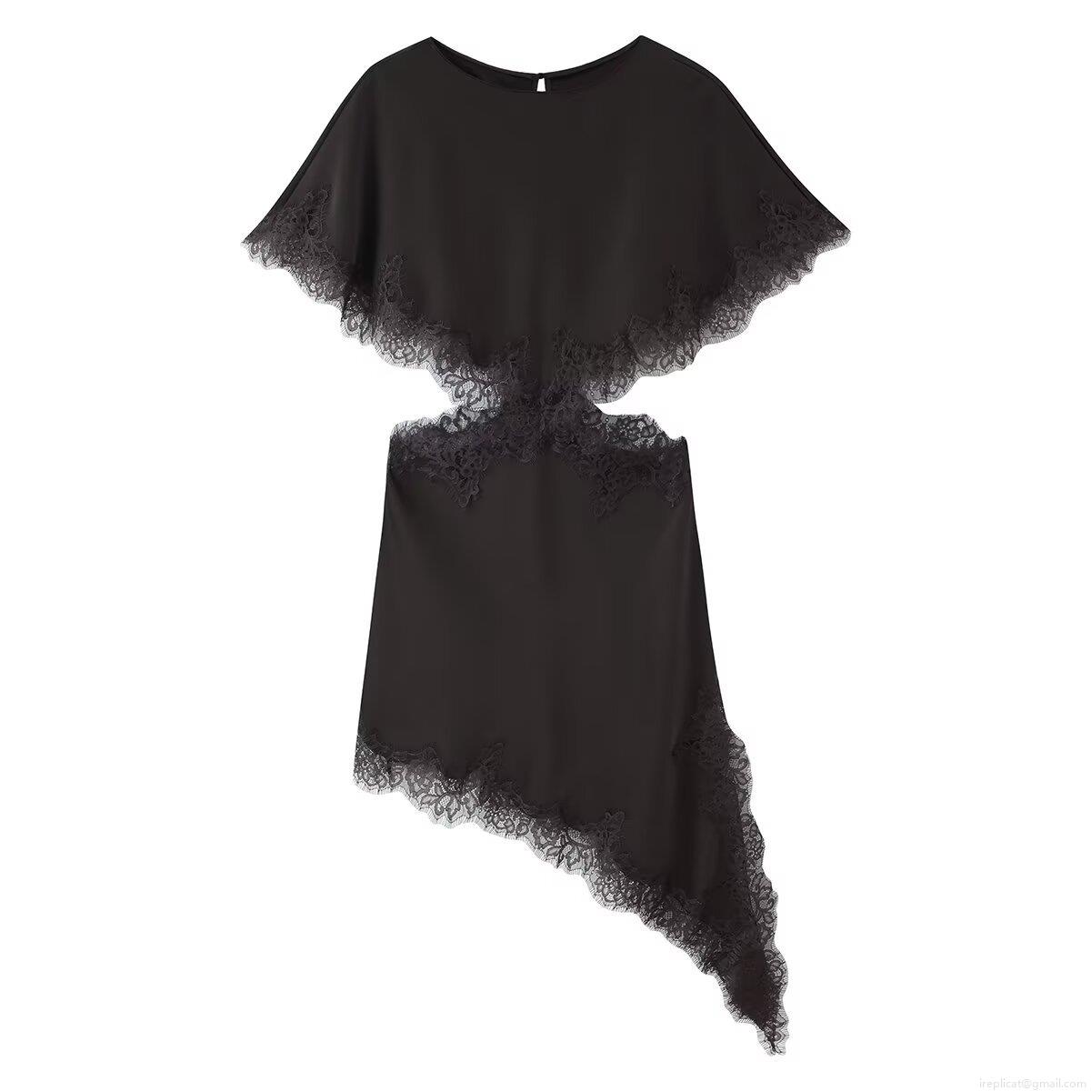 Solid Color, Splice, Lace, Hollow Out, Lace Floral, Asymmetrical Hem, Waist