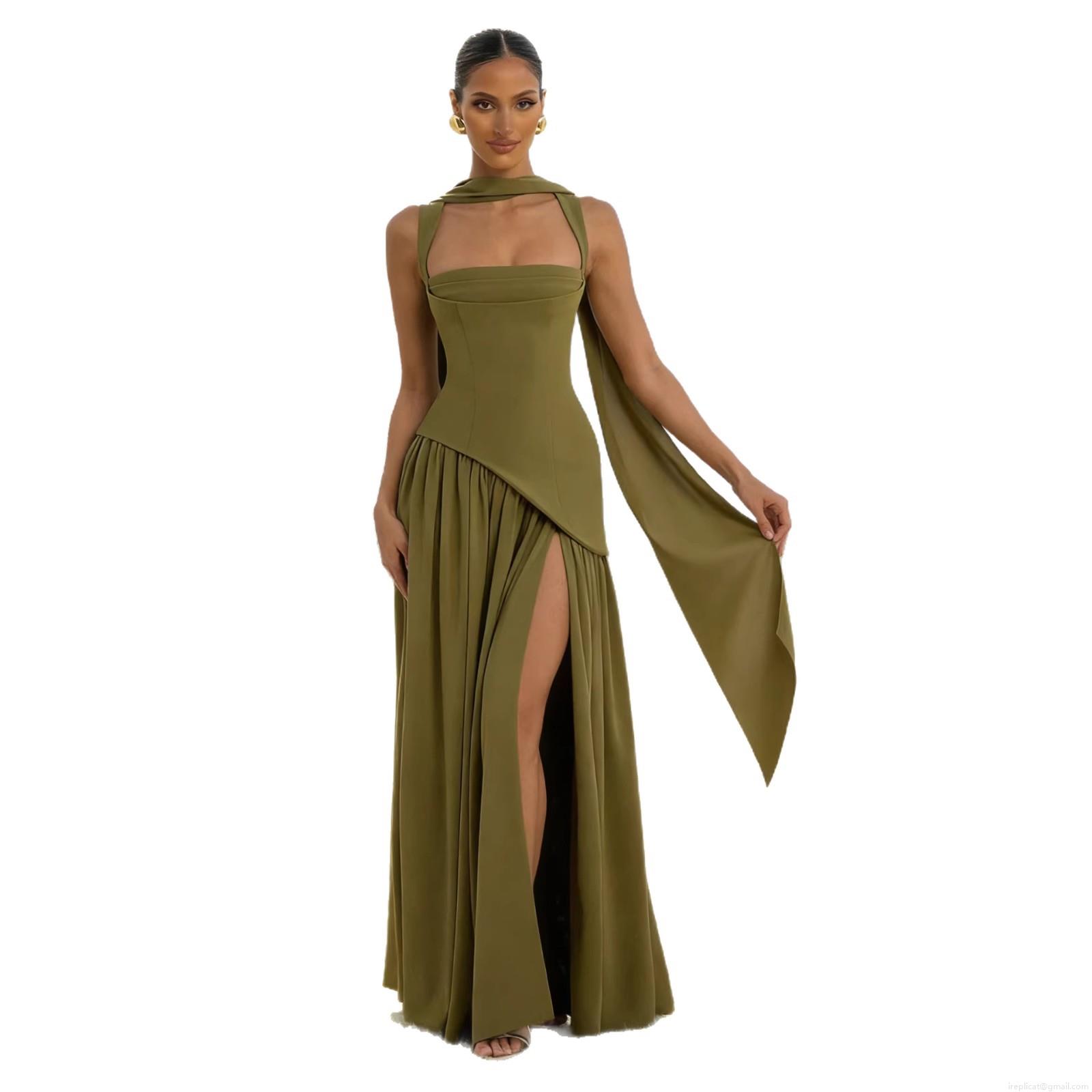 Women's Sexy Backless Halter Neck Maxi Dress Elegant Split Hem Bodycon Satin Evening Gown with Matching Neck Scarf Party Long Dress