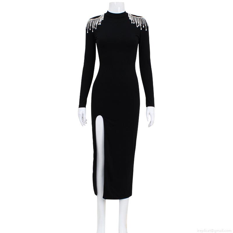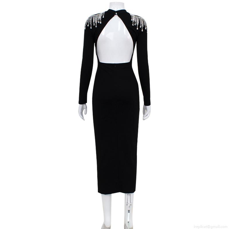 • Women's Sexy Backless Maxi Dress Mock Neck Rhinestone Fringe Epaulettes High Slit Elegant Long Sleeve Slim Fit Evening Gown Party Dress