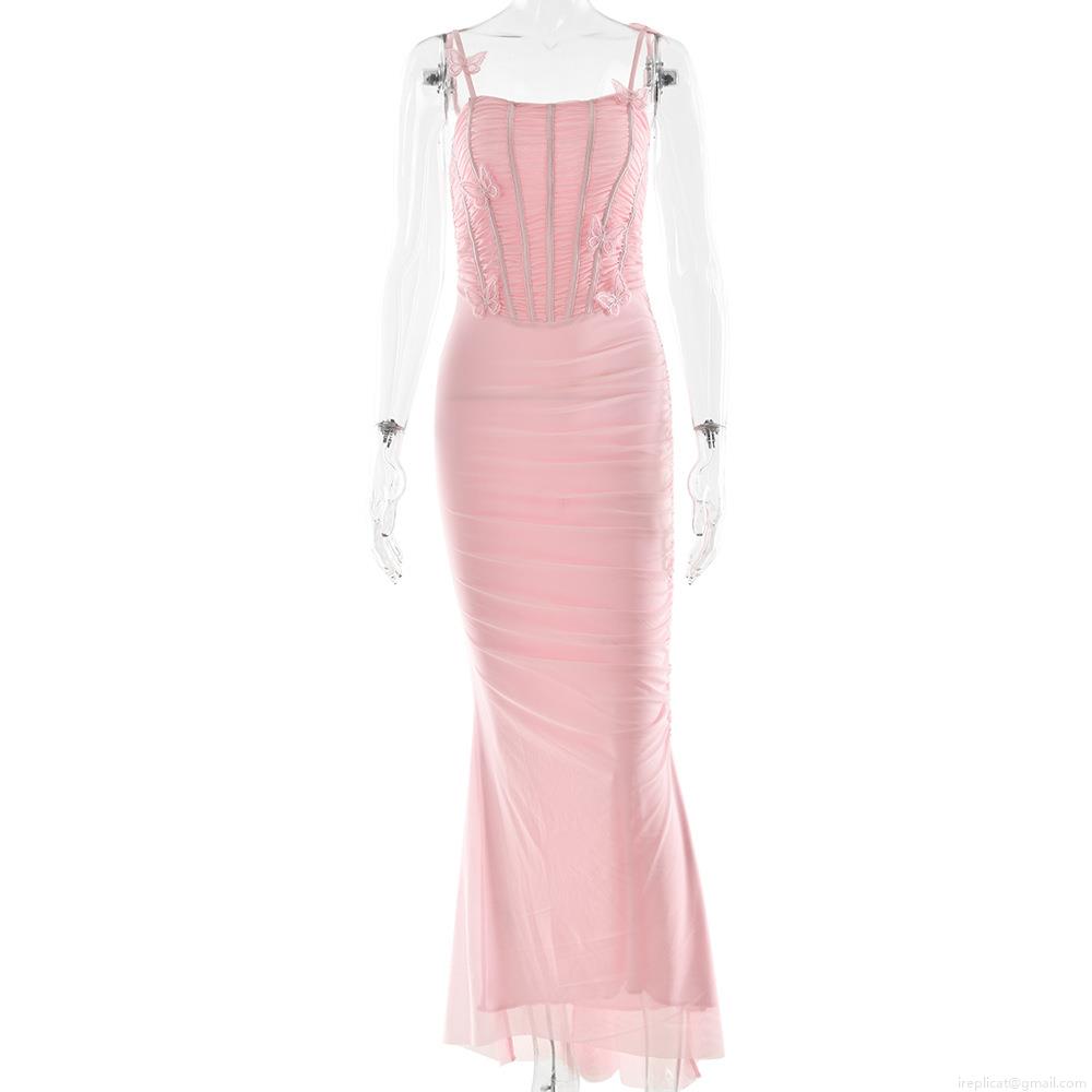 Women's Sexy Backless Ruched Cami Maxi Dress Milk Silk Mesh Bodycon Spaghetti Strap Fishtail Evening Party Wedding Guest Slim Fit Long Gown