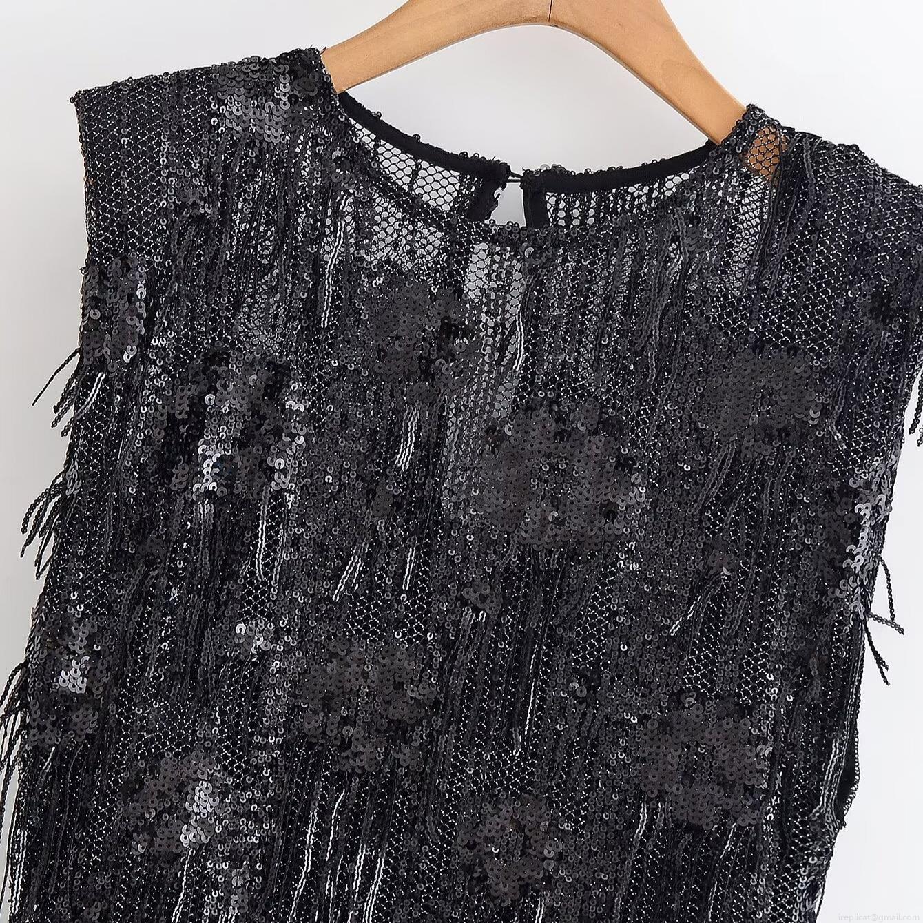 Women's Sexy Black Sequin Fringe Asymmetric Dress Sleeveless Round Neck Party Evening Bodycon Midi Dress Sparkly Clubwear Banquet Gown