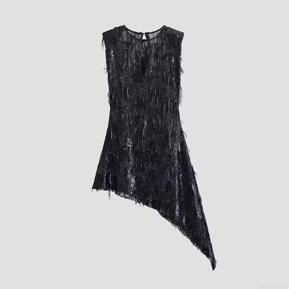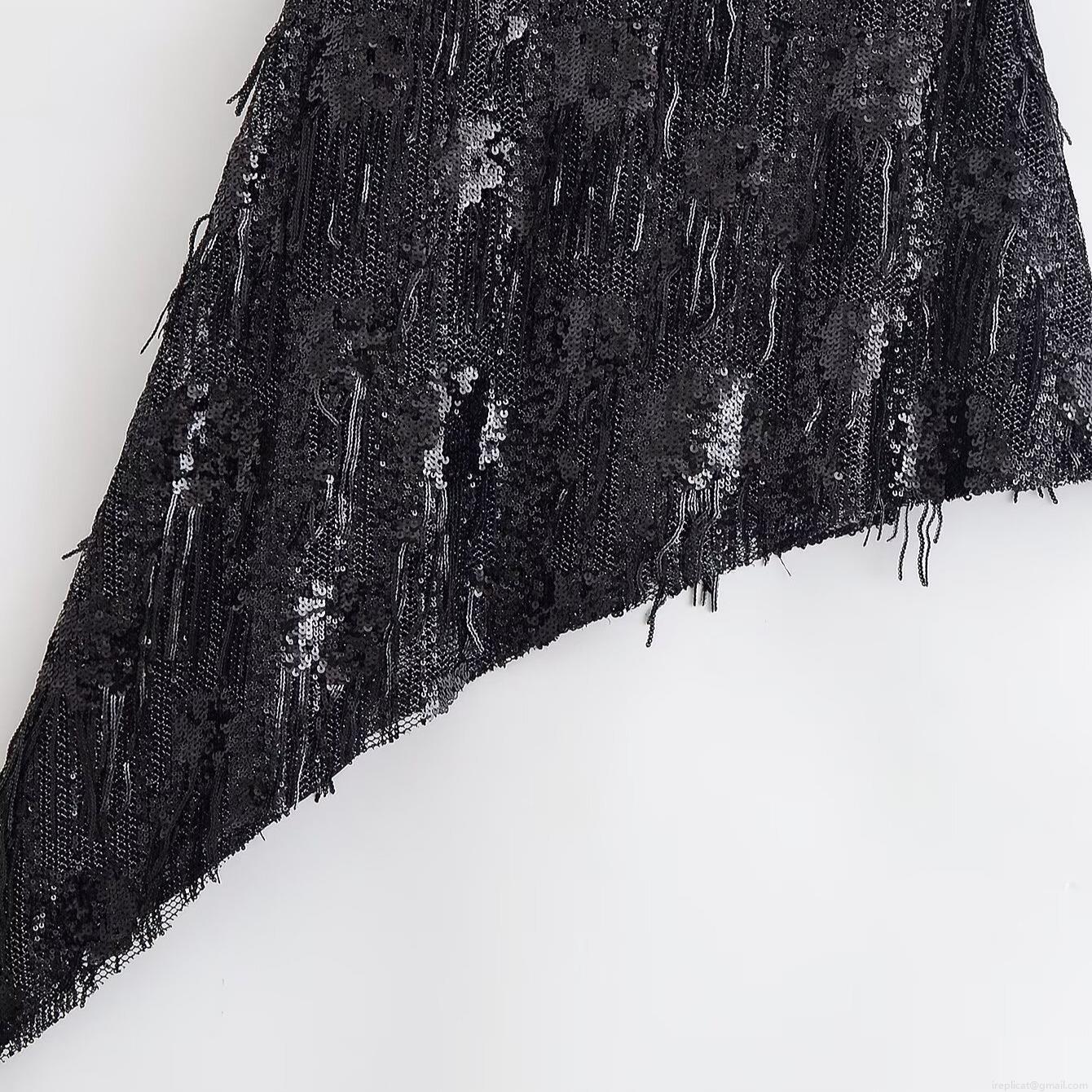• Women's Sexy Black Sequin Fringe Asymmetric Dress Sleeveless Round Neck Party Evening Bodycon Midi Dress Sparkly Clubwear Banquet Gown