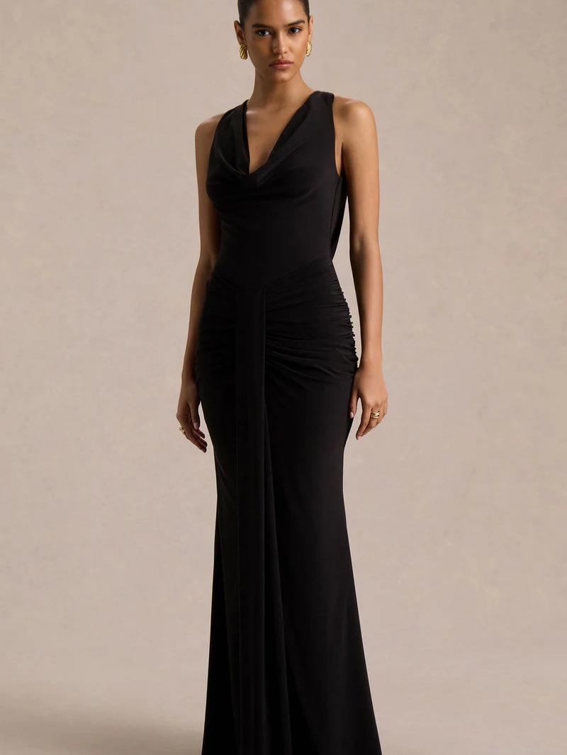 Women's Sexy Cowl Neck Ruched Evening Dress Sleeveless High Waist Slim Fit Solid Color Maxi Party Gown for Banquet Wedding