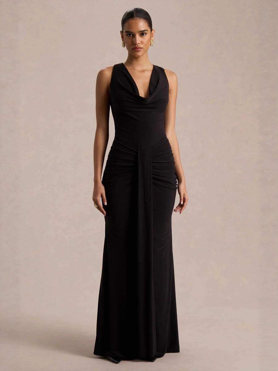 • Women's Sexy Cowl Neck Ruched Evening Dress Sleeveless High Waist Slim Fit Solid Color Maxi Party Gown for Banquet Wedding