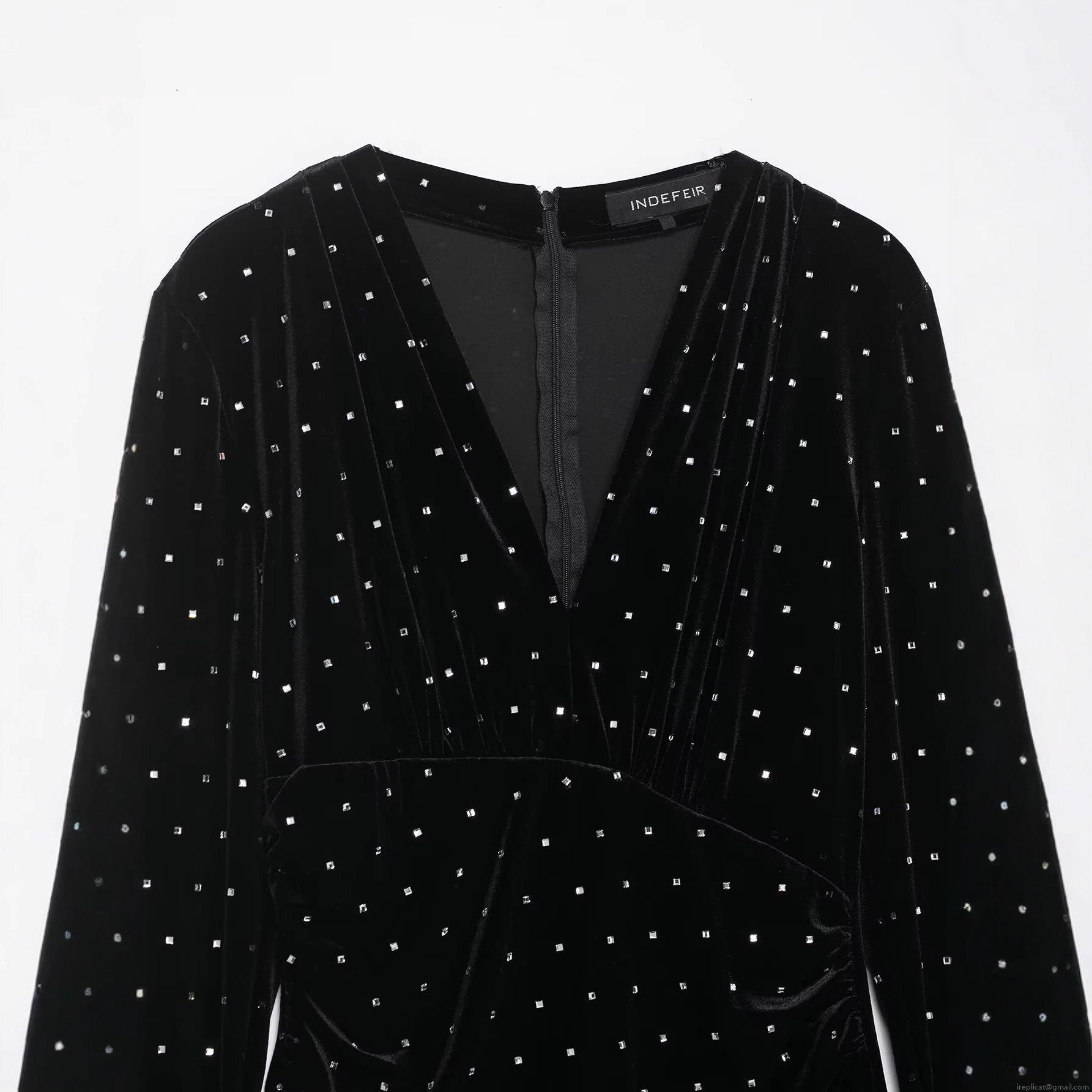 • Women's Sexy Deep V Neck Long Sleeve Velvet Maxi Dress With Silver Square Rhinestones Side Slit Elegant Slim Fit A-Line Evening Party Long Dress