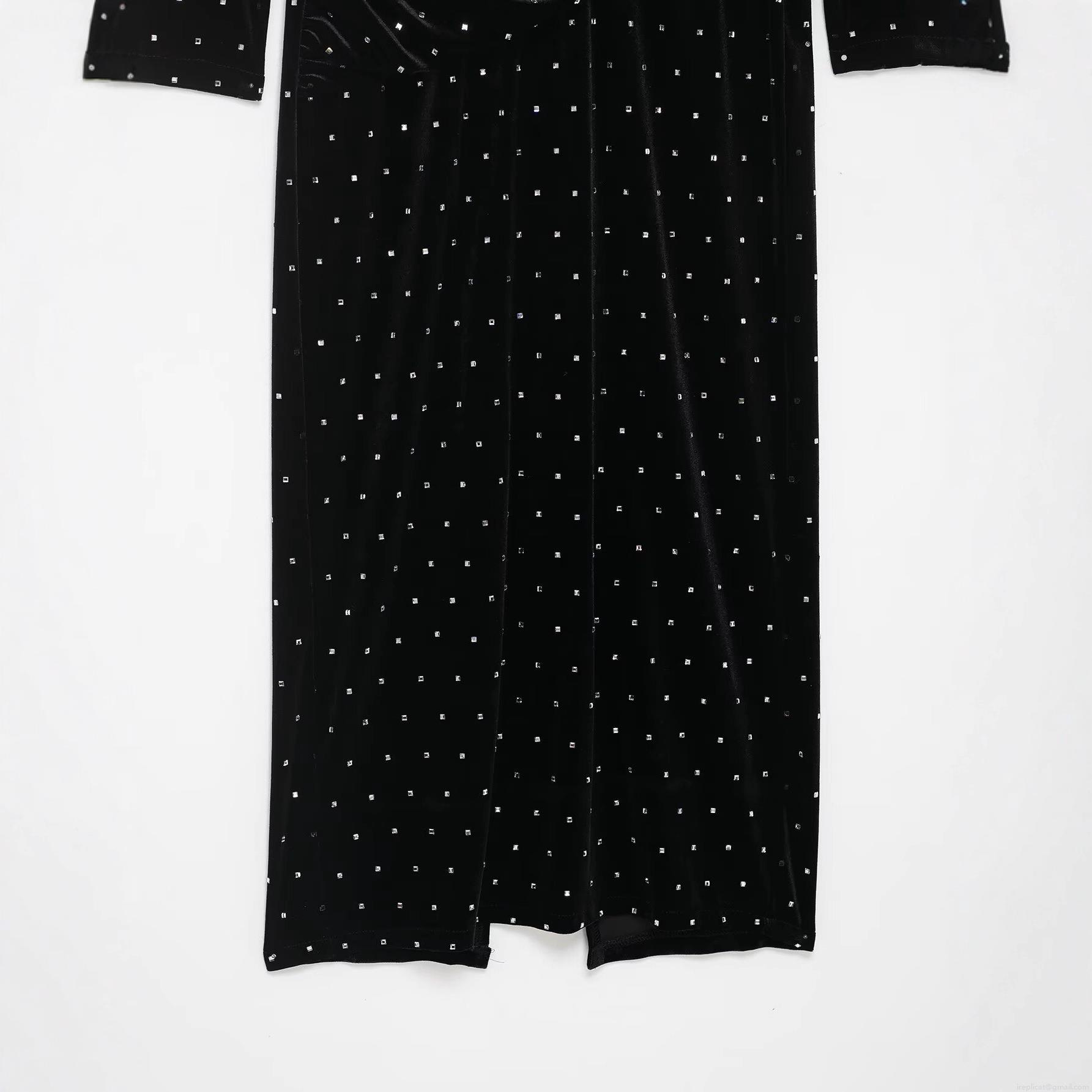 Women's Sexy Deep V Neck Long Sleeve Velvet Maxi Dress With Silver Square Rhinestones Side Slit Elegant Slim Fit A-Line Evening Party Long Dress