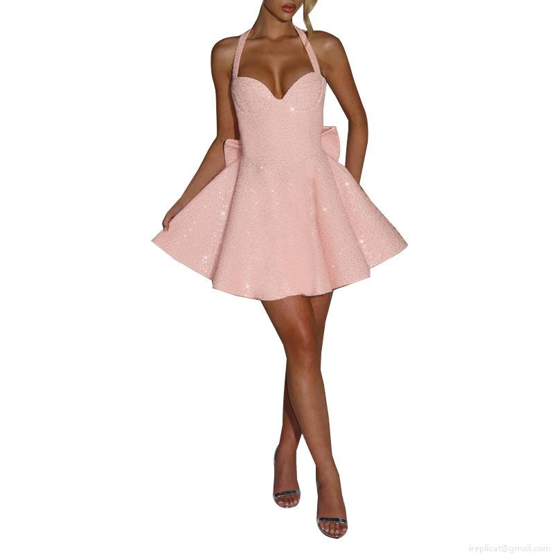 Women's Sexy Halter Backless Sequin Mini Dress With Large Bow Elegant Party Club Night Out A-Line Evening Prom Dress Pink White