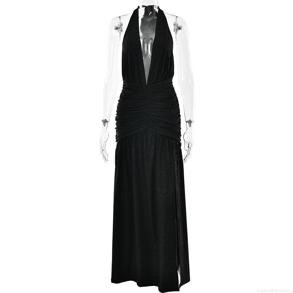 Women's Sexy Halter Deep V Neck High Slit Maxi Dress Backless Glitter Sequins Party Evening Gown Milk Silk Polyester Bodycon Long Dress