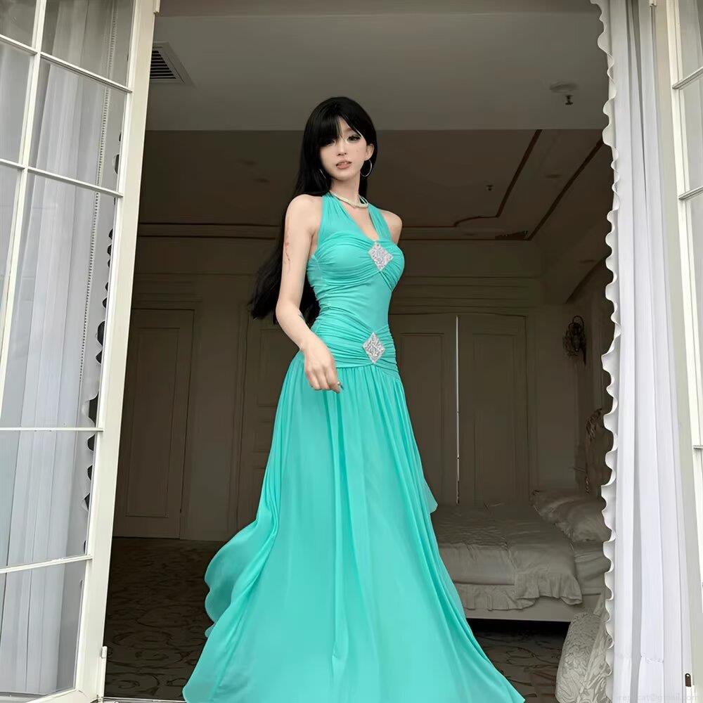 Women's Sexy Halter Neck Backless Maxi Dress Teal Mesh Pleated Long Dress With Rhinestone Elegant Party Evening Formal Dress Sleeveless A-Line Gown