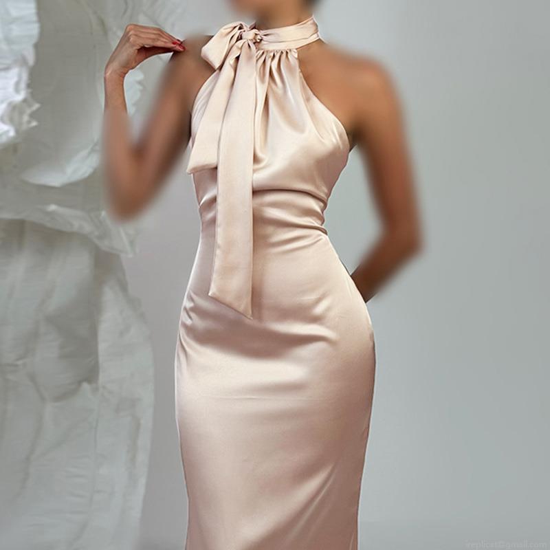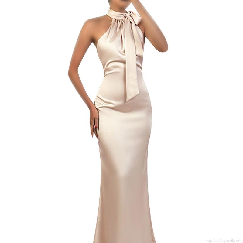 Women's Sexy Halter Neck Satin Evening Dress Backless Bow Tie Slim Fit Fishtail Maxi Gown Polyester Spandex For Wedding Banquet Party Apricot